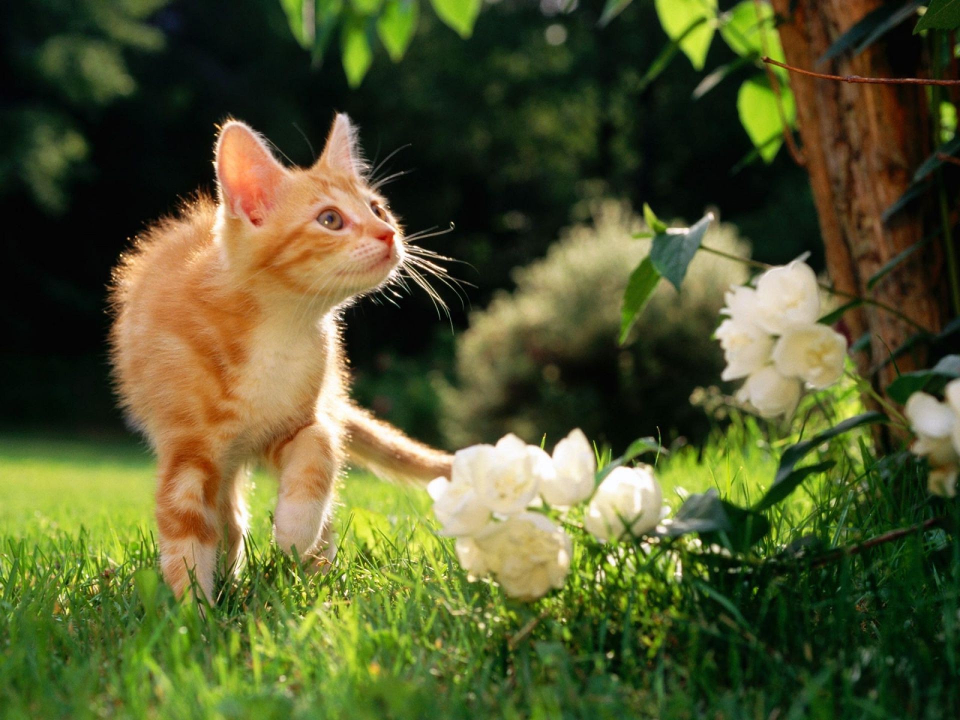 Rudowłosy Słodki kotek na trawie patrzy na kwiaty