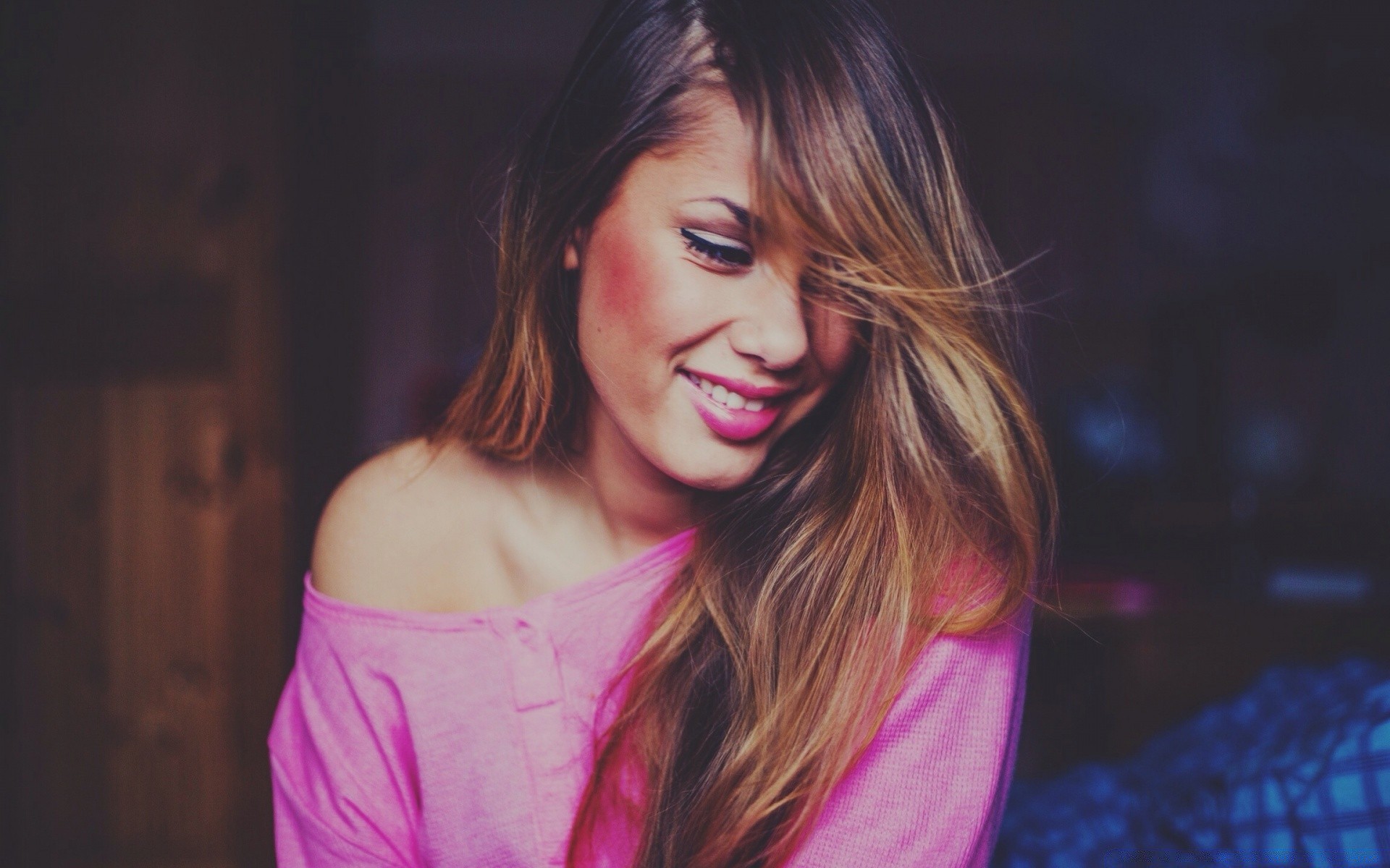 Dziewczyna z długimi włosami w różowym swetrze