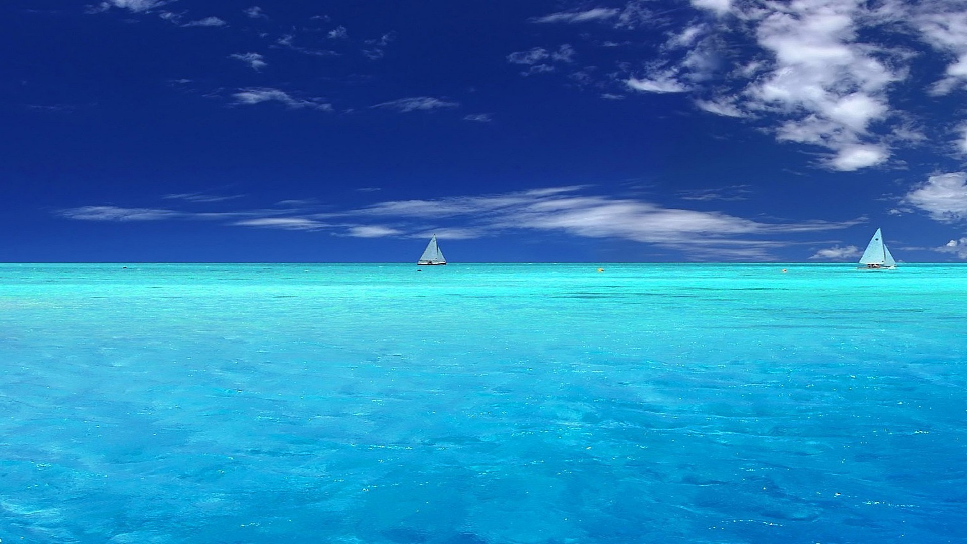 Kolaż zdjęć. Jacht z białymi żaglami. Biały piasek. Błękitne niebo z białymi chmurami. Kolorowe rozgwiazdy