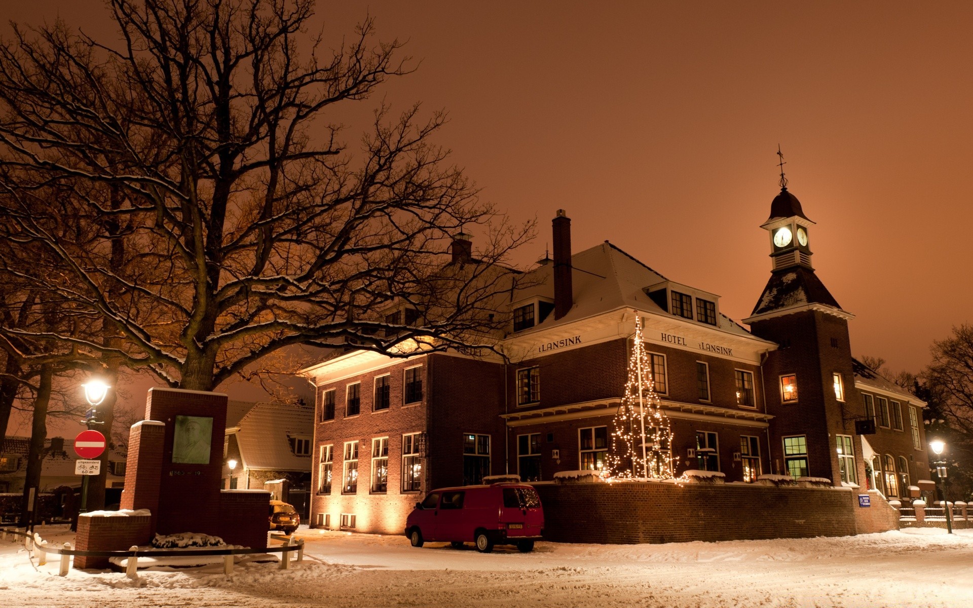 Zimowy krajobraz w Holandii. Architektura Hagelo