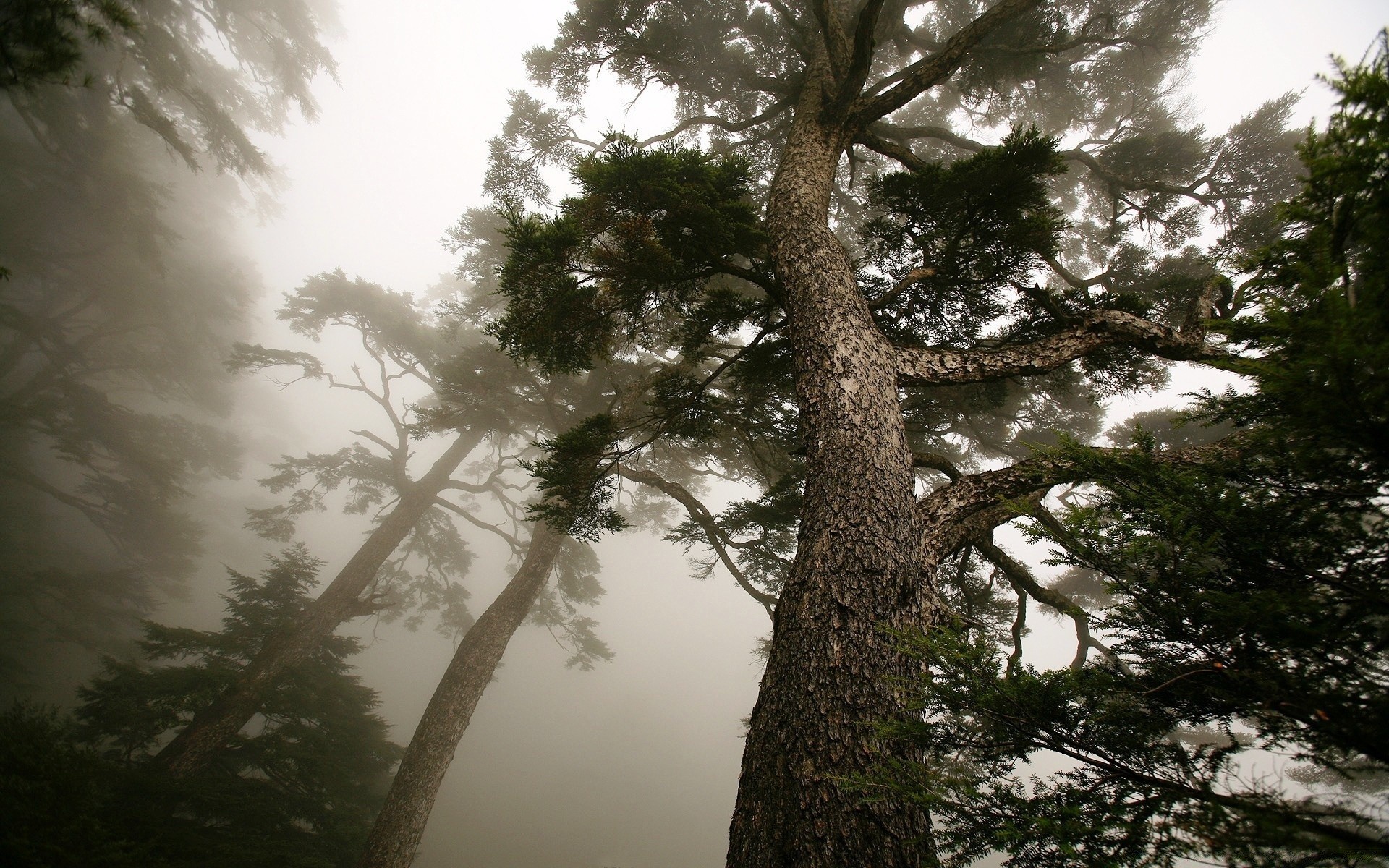 Wysokie drzewa w silnej mgle