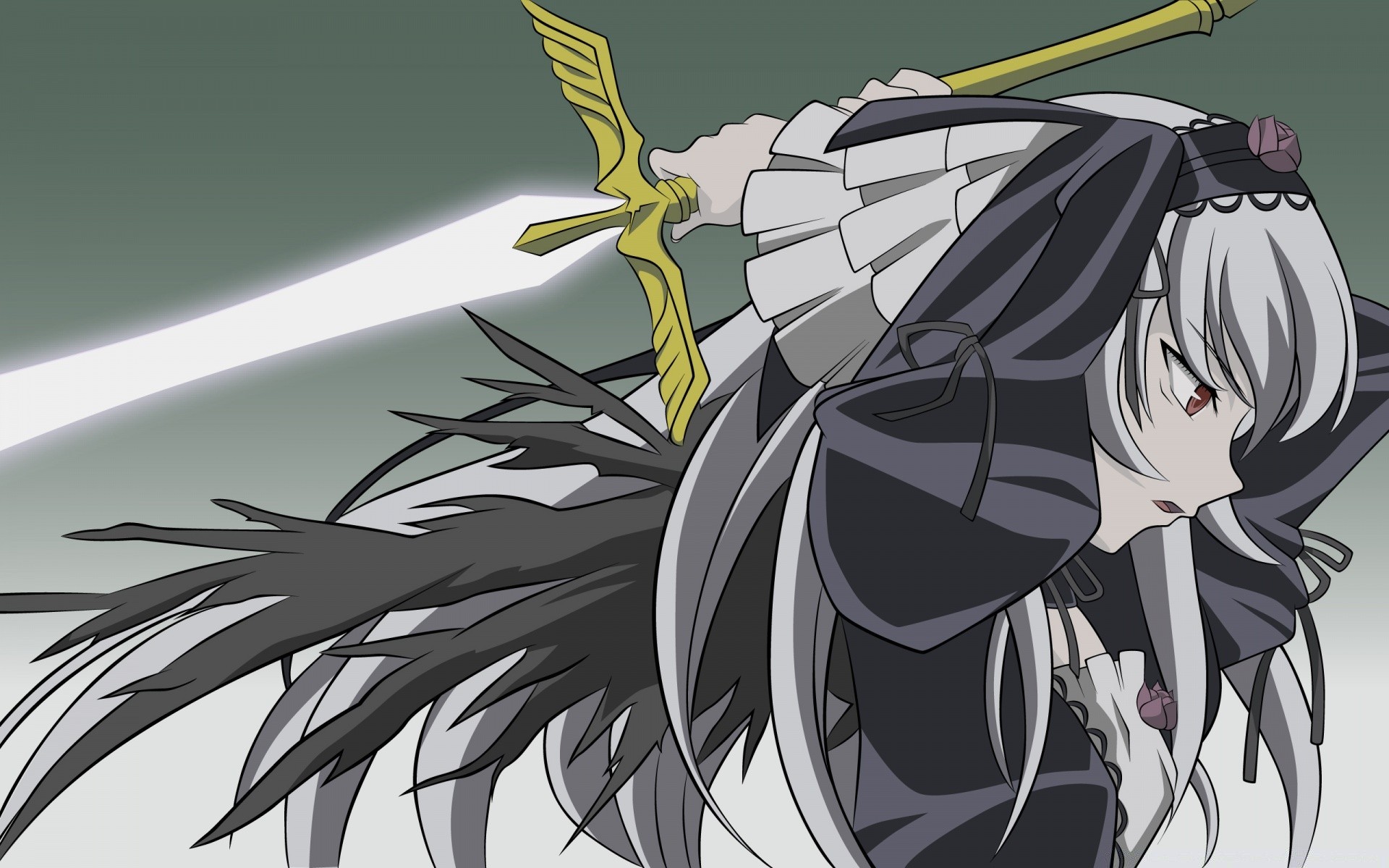 Bohaterka anime, dziewczyna w czarno-szarej sukience z mieczemBohaterka anime, dziewczyna w czarno-szarej sukience z mieczem