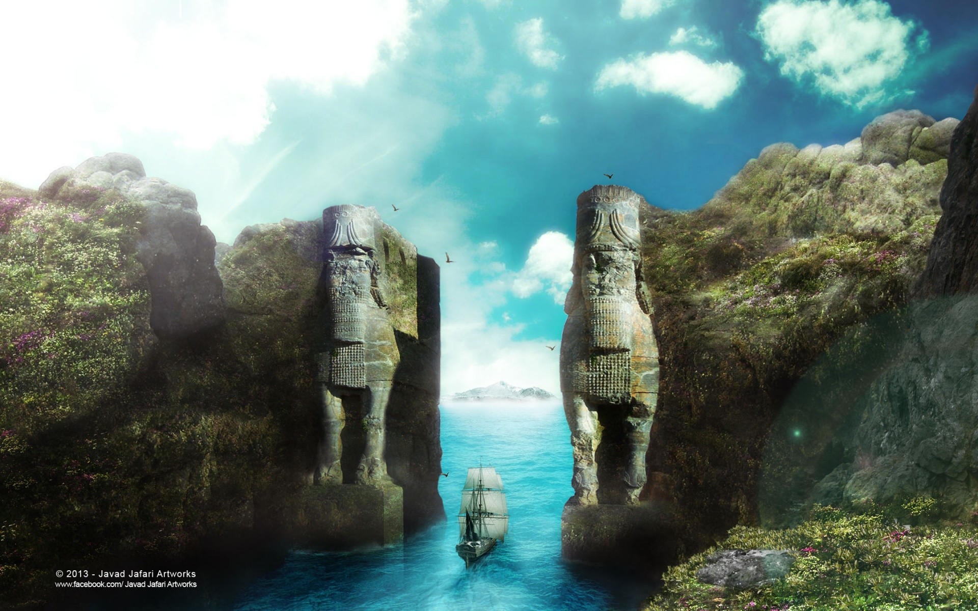 Statek płynie obok niesamowitych skał z rzeźbionymi rzeźbami