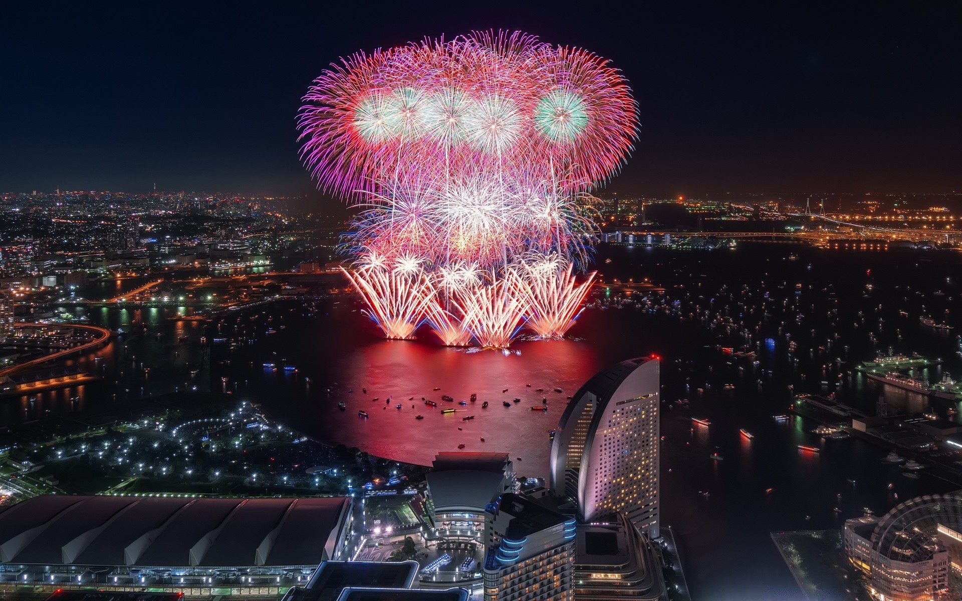Piękne fajerwerki w wieczornym mieście zachwycają