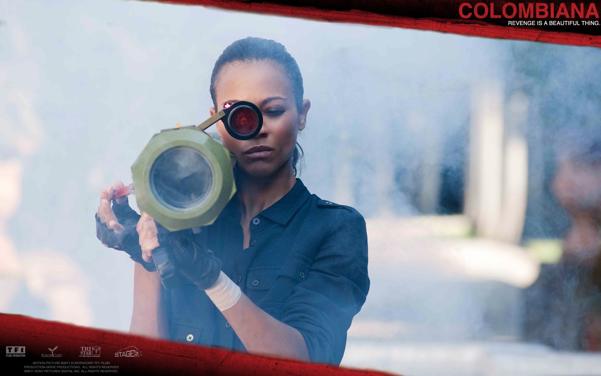 Plakat filmowy z dwoma aktorami w białych marynarkach z pistoletami