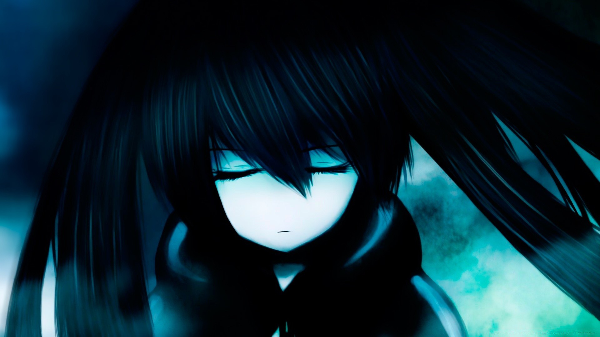 Portret długowłosej dziewczyny w stylu anime, w czarnej sukience i nakryciu głowyPortret długowłosej dziewczyny w stylu anime, w czarnej sukience i nakryciu głowy
