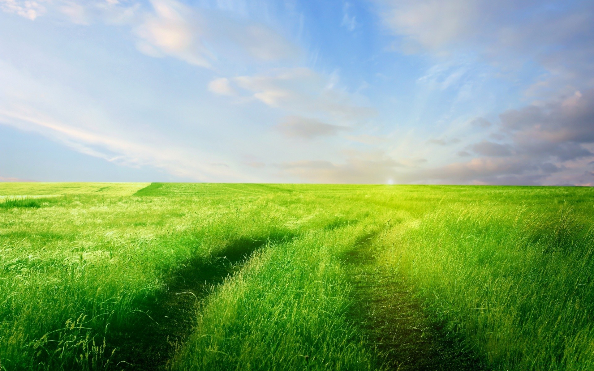 Piękny krajobraz. Trawa limonkowa. Czyste niebo