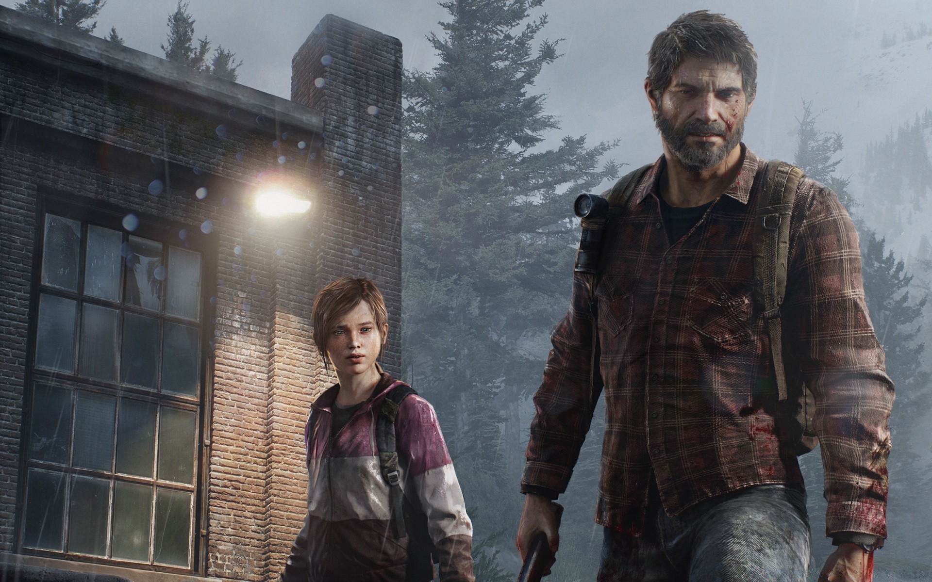 Uzbrojony mężczyzna i nastolatek, murowany dom na skraju lasu iglastego, zmierzchUzbrojony mężczyzna i nastolatek, murowany dom na skraju lasu iglastego, zmierzch