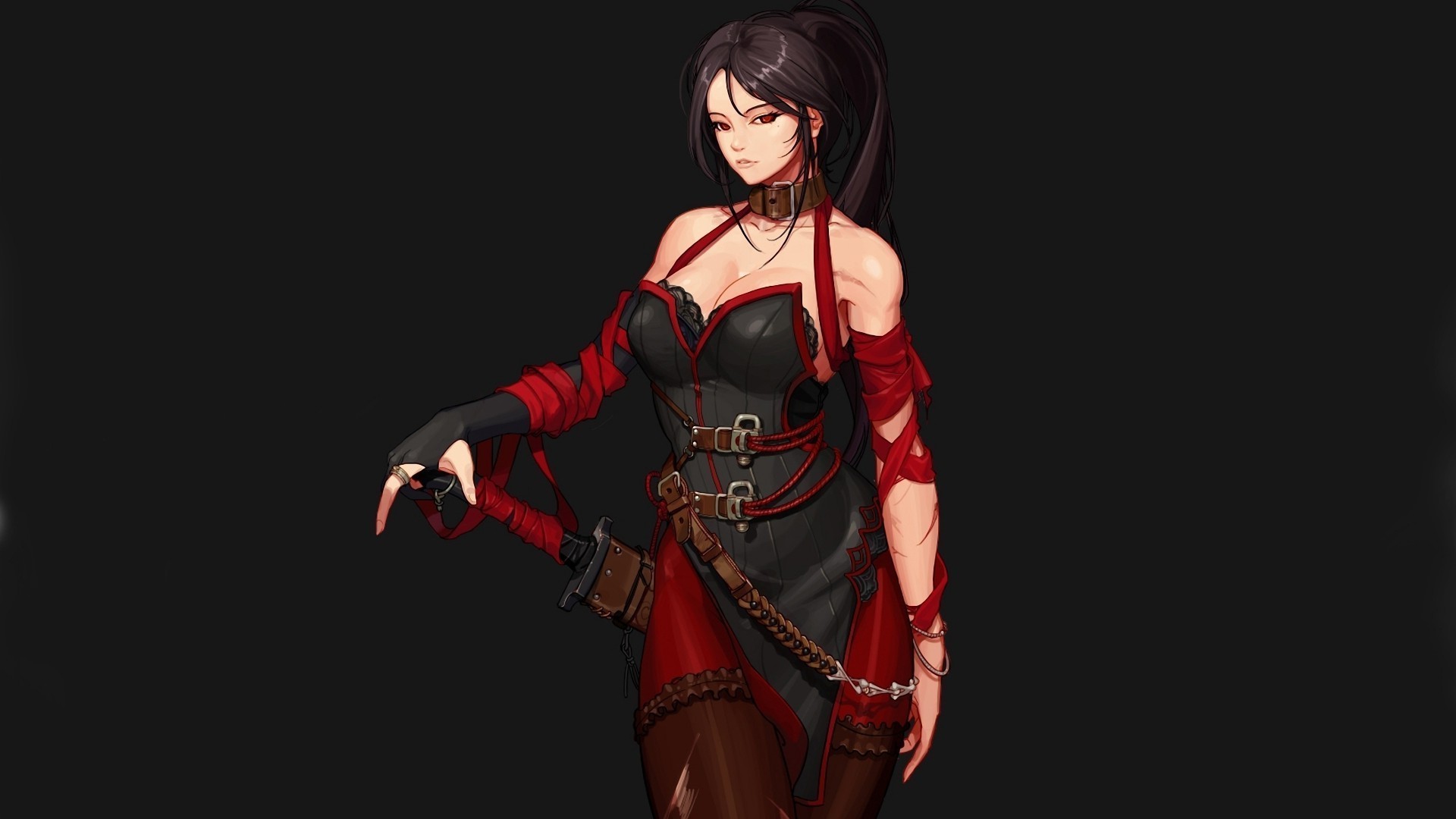 Wojowniczka w czarno-czerwonej szacie z mieczem w pochwie