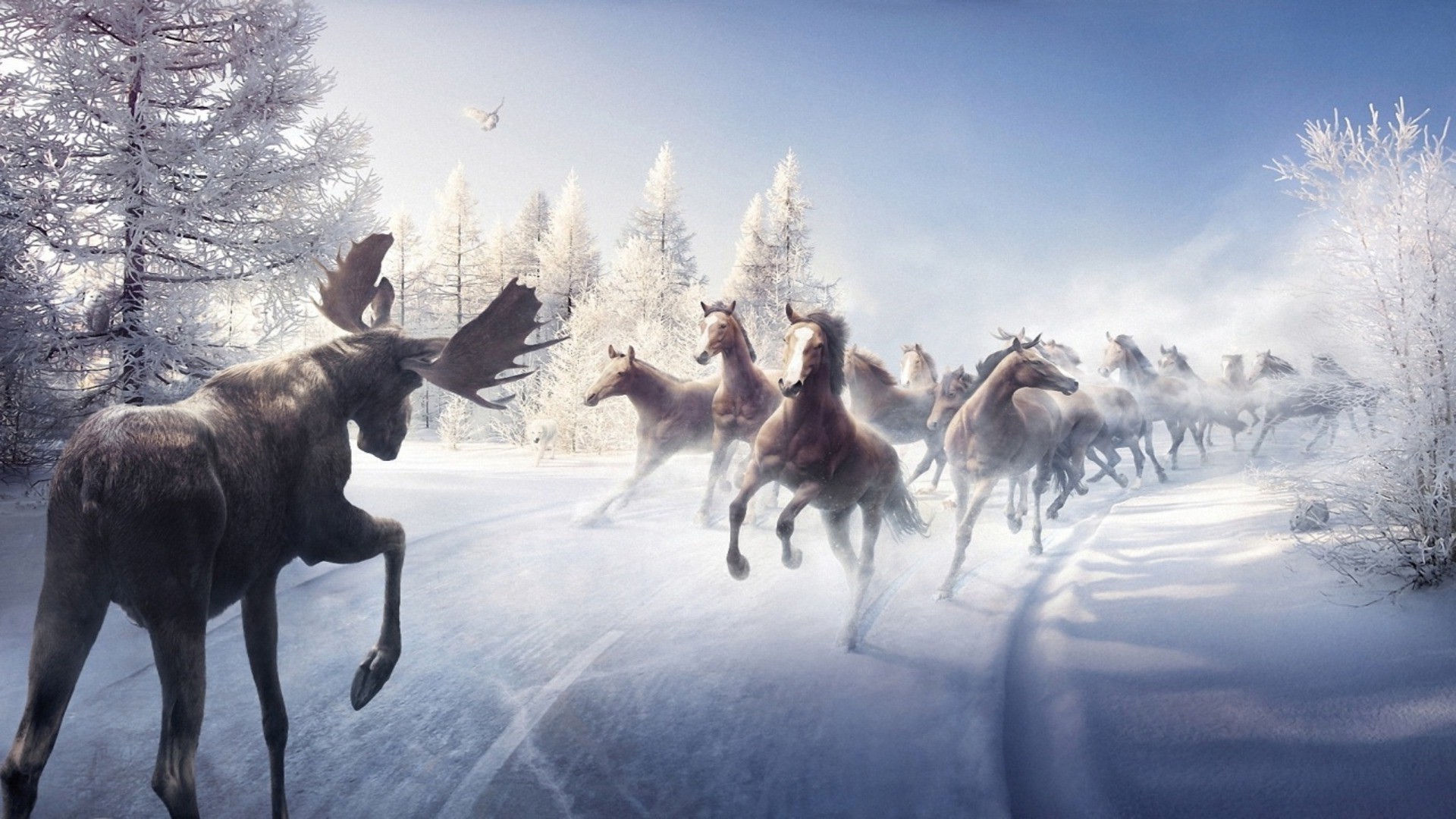 Trzy konie galopują po stepie na tle zachodzącego słońca