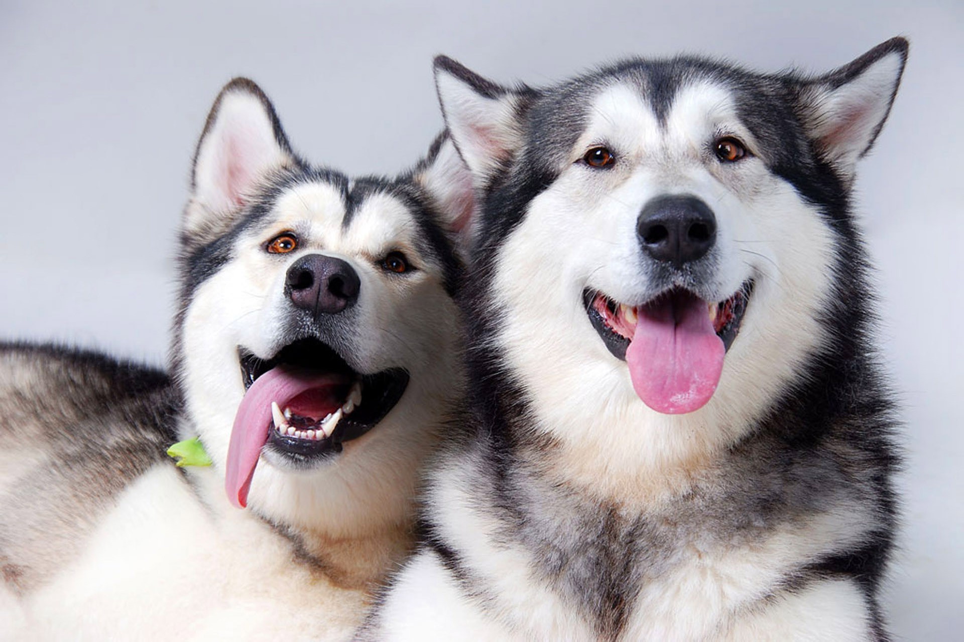 Dwie rasowe Husky wystawiły swoje różowe języki