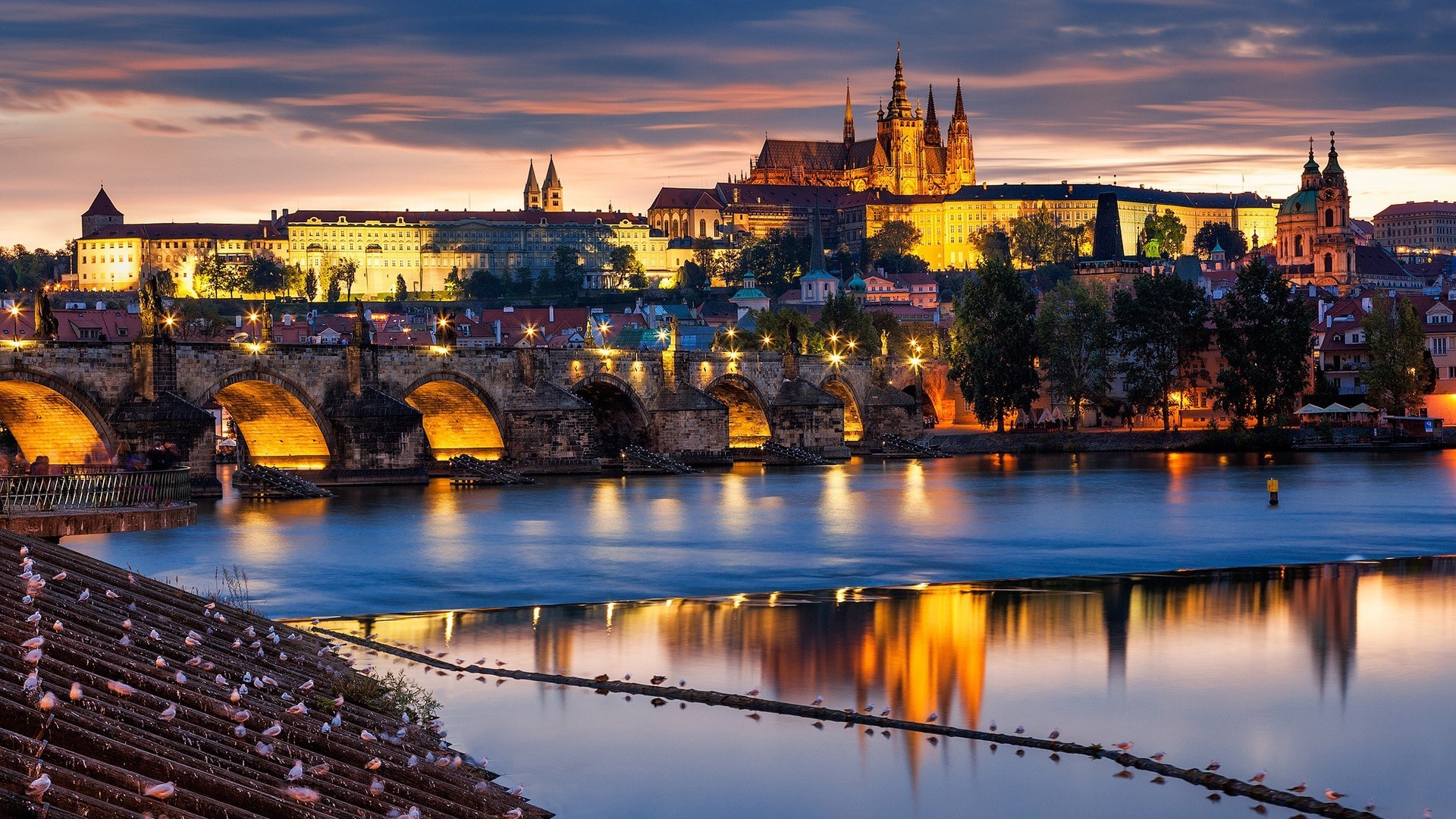 Architektura nocnego miasta z długim mostem nad powierzchnią wody