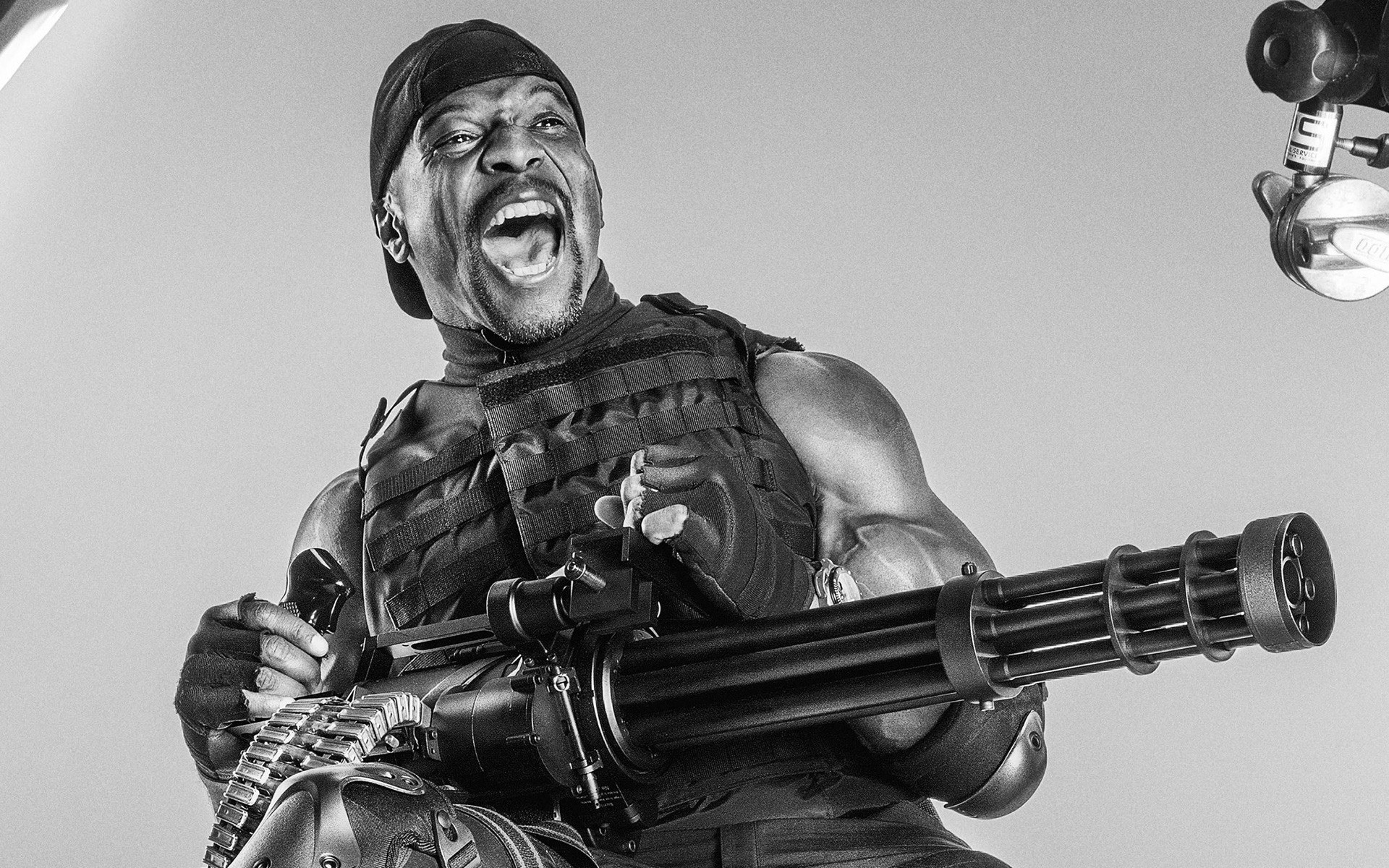 Ciemnoskóry facet w czapce i kamizelce kuloodpornej trzyma karabin maszynowy