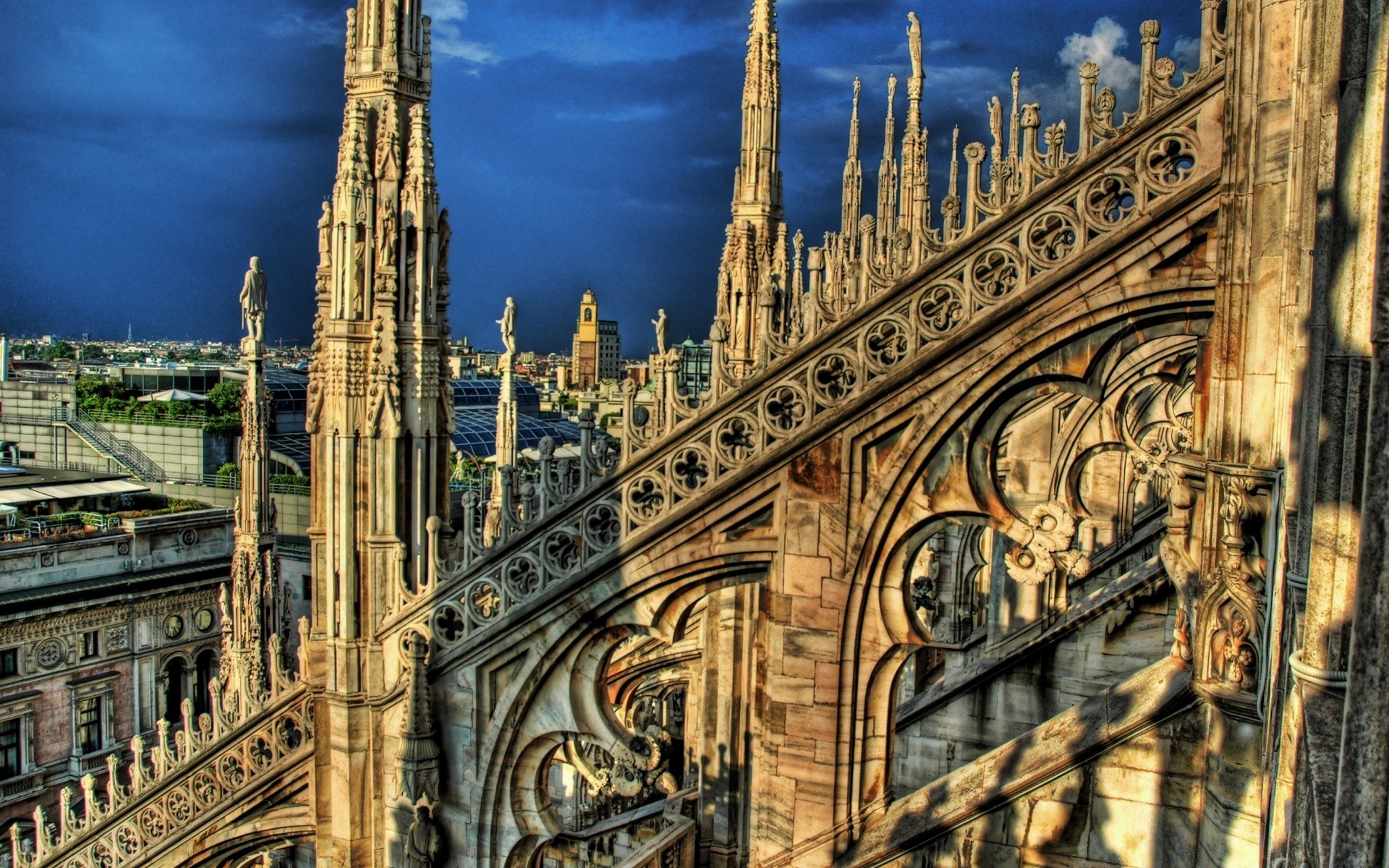 Czarno-biały obraz zabytków ze względu na korony drzew