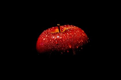 Ciemne tło. Czerwone jabłko. Kropelki na jabłku