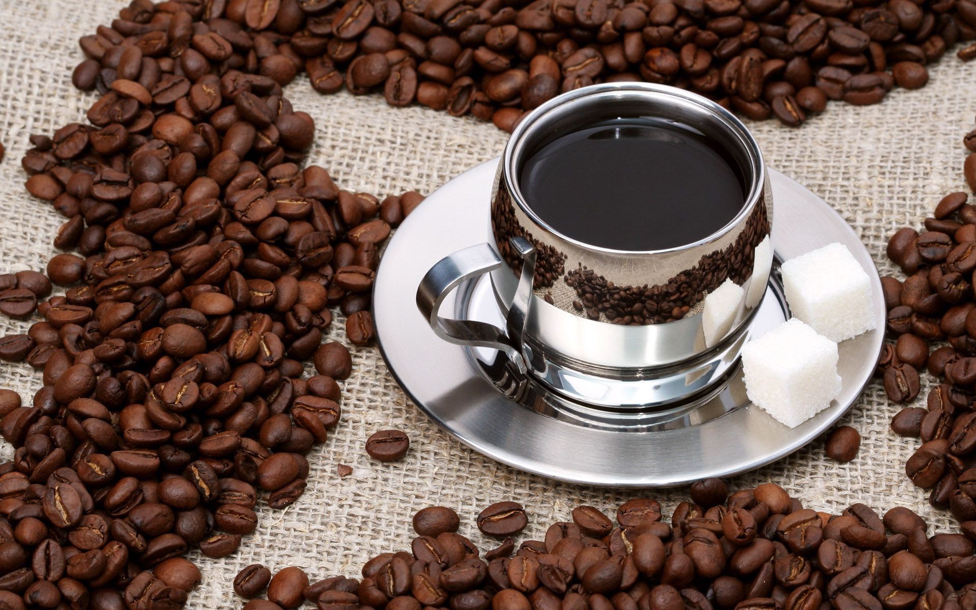 Czerwona filiżanka z podstawką na ziarnach kawy