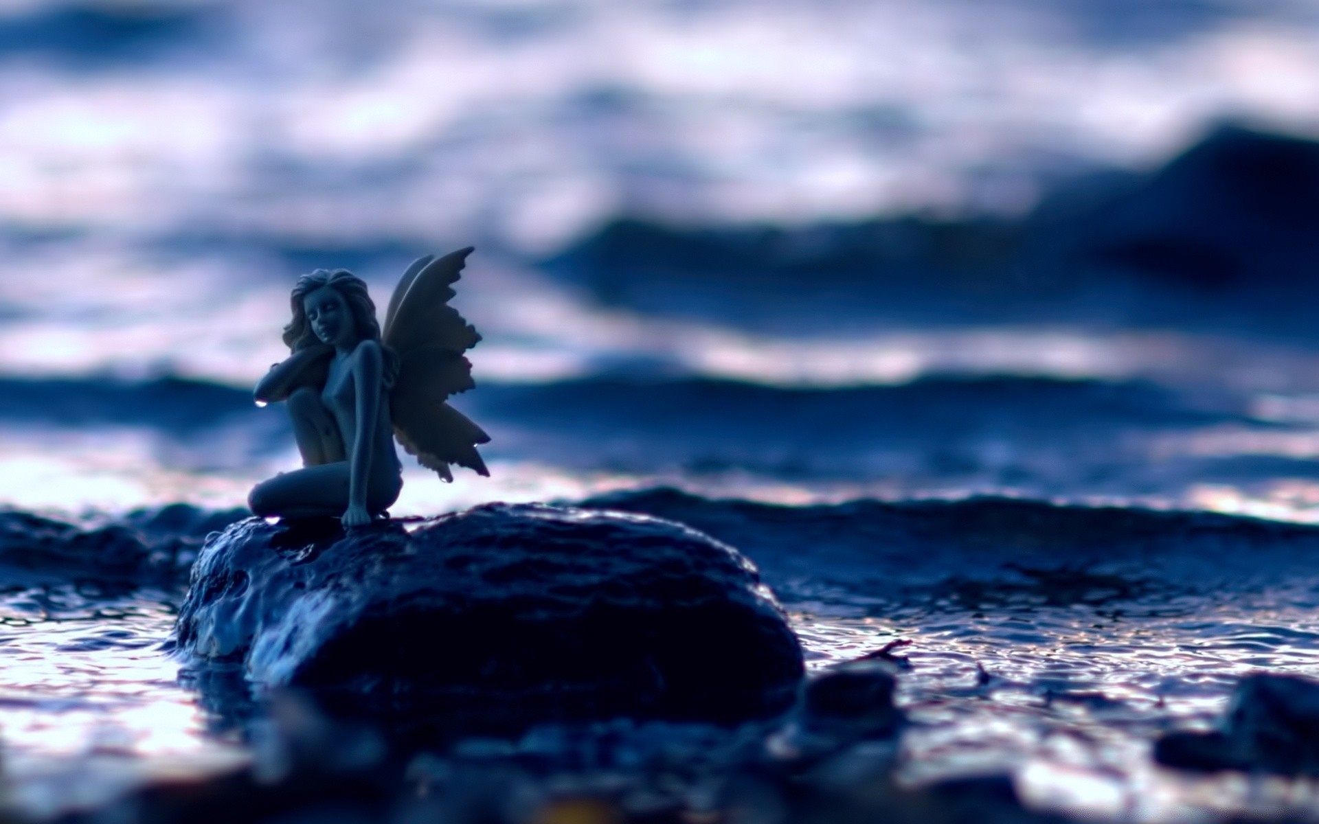 Kobieta ze skrzydłami na kamieniu nad morzem