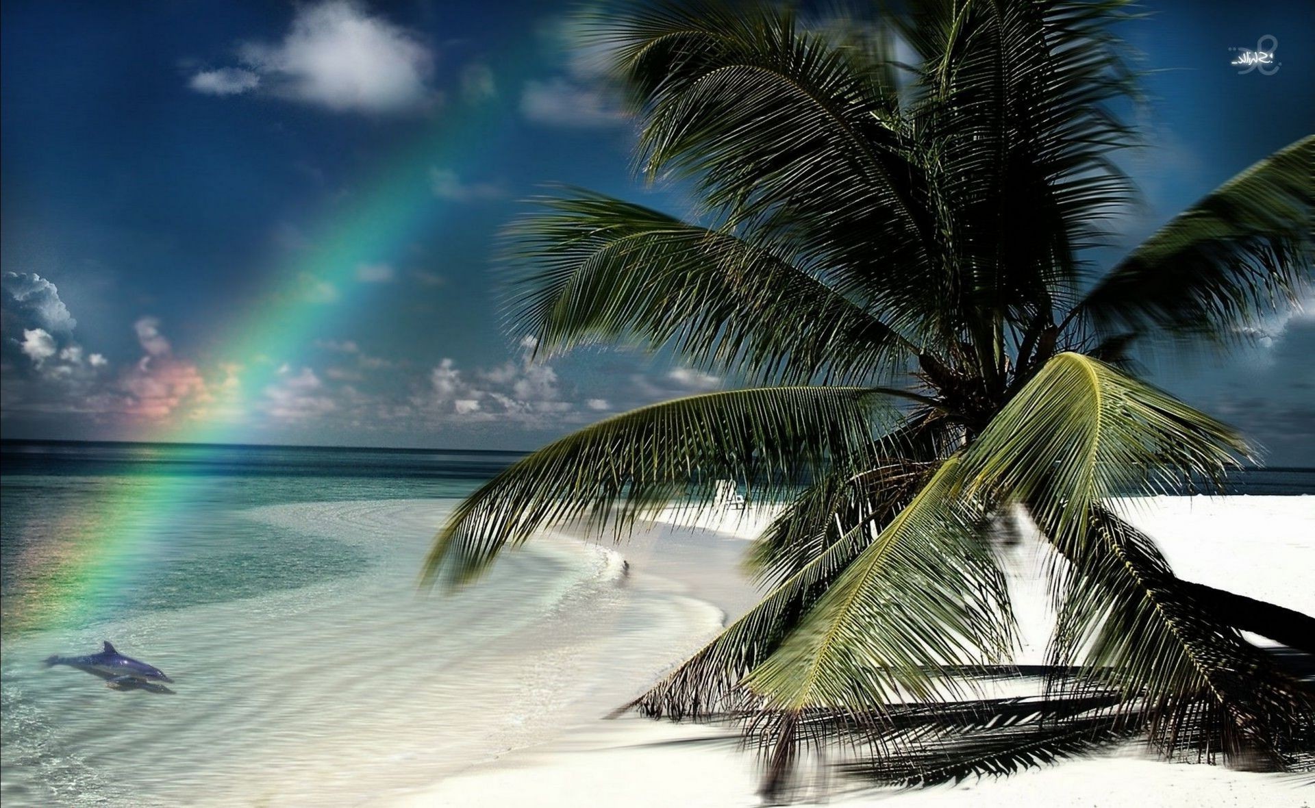 Tapeta z tropikalną plażą, oceanem i tęczą na górze