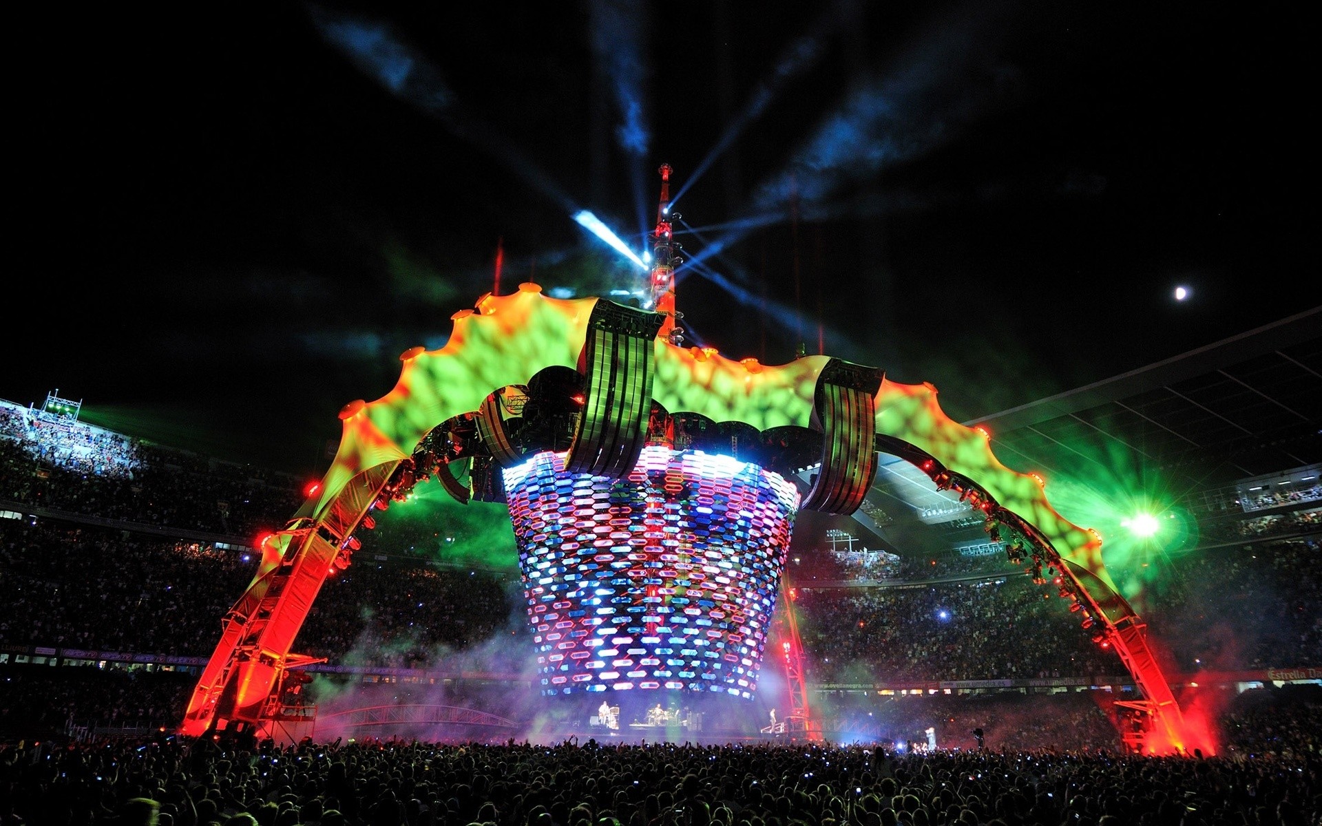 Pokazy na Festiwalu Muzycznym, Arena wypełniona publicznością, ogromne dekoracje na scenie