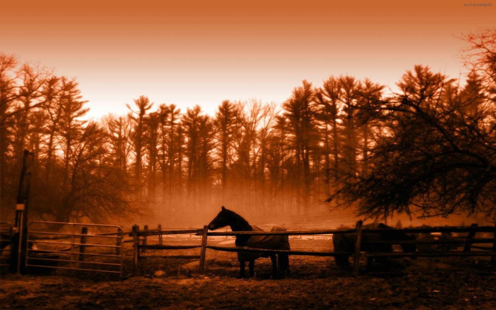 Konie spacerują o zachodzie słońca w pobliżu drzewKonie spacerują o zachodzie słońca w pobliżu drzew