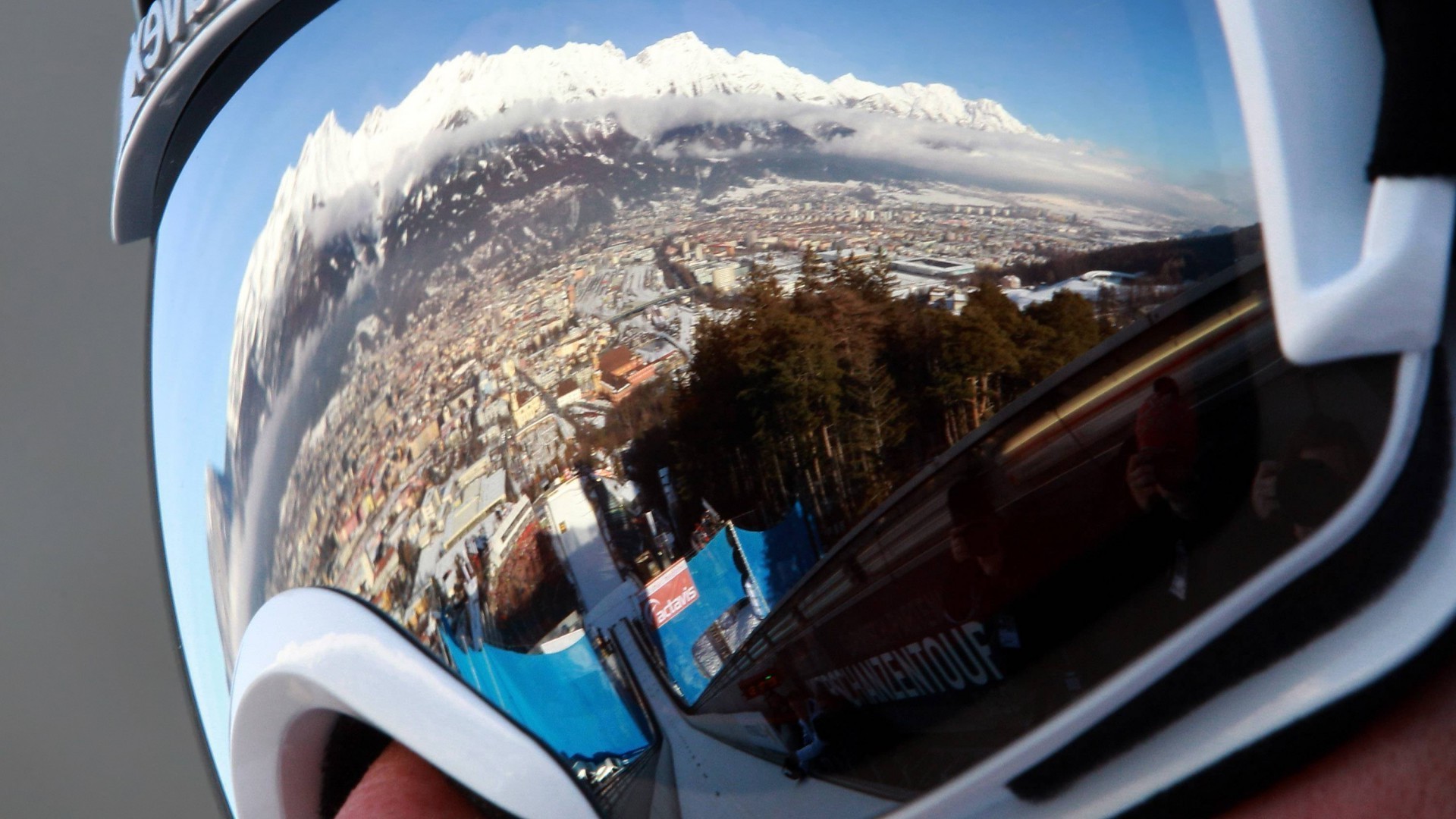 Odbicie gór w okularach snowboardzisty