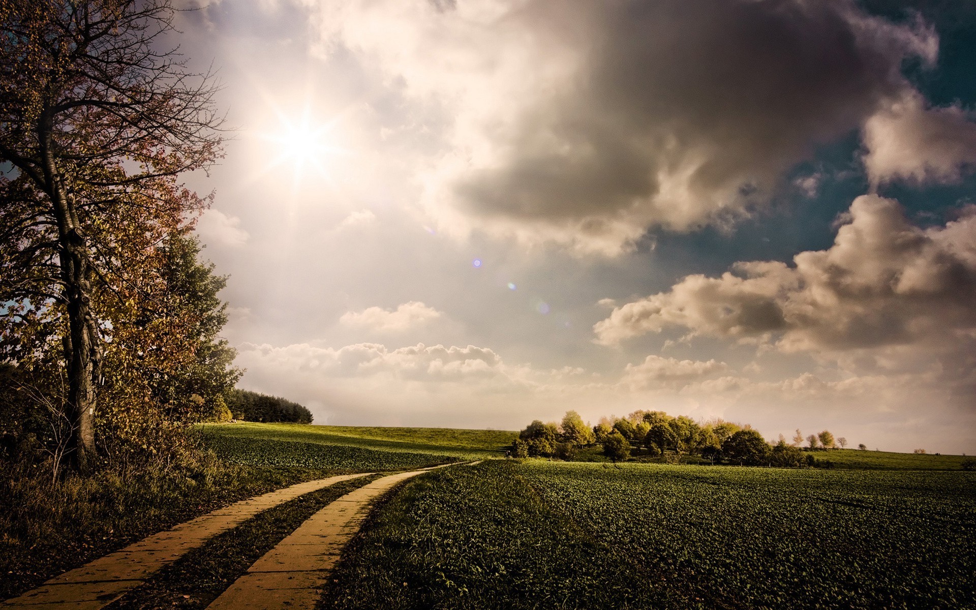 Pole skoszonej trawy zebrane w bele o zachodzie słońca