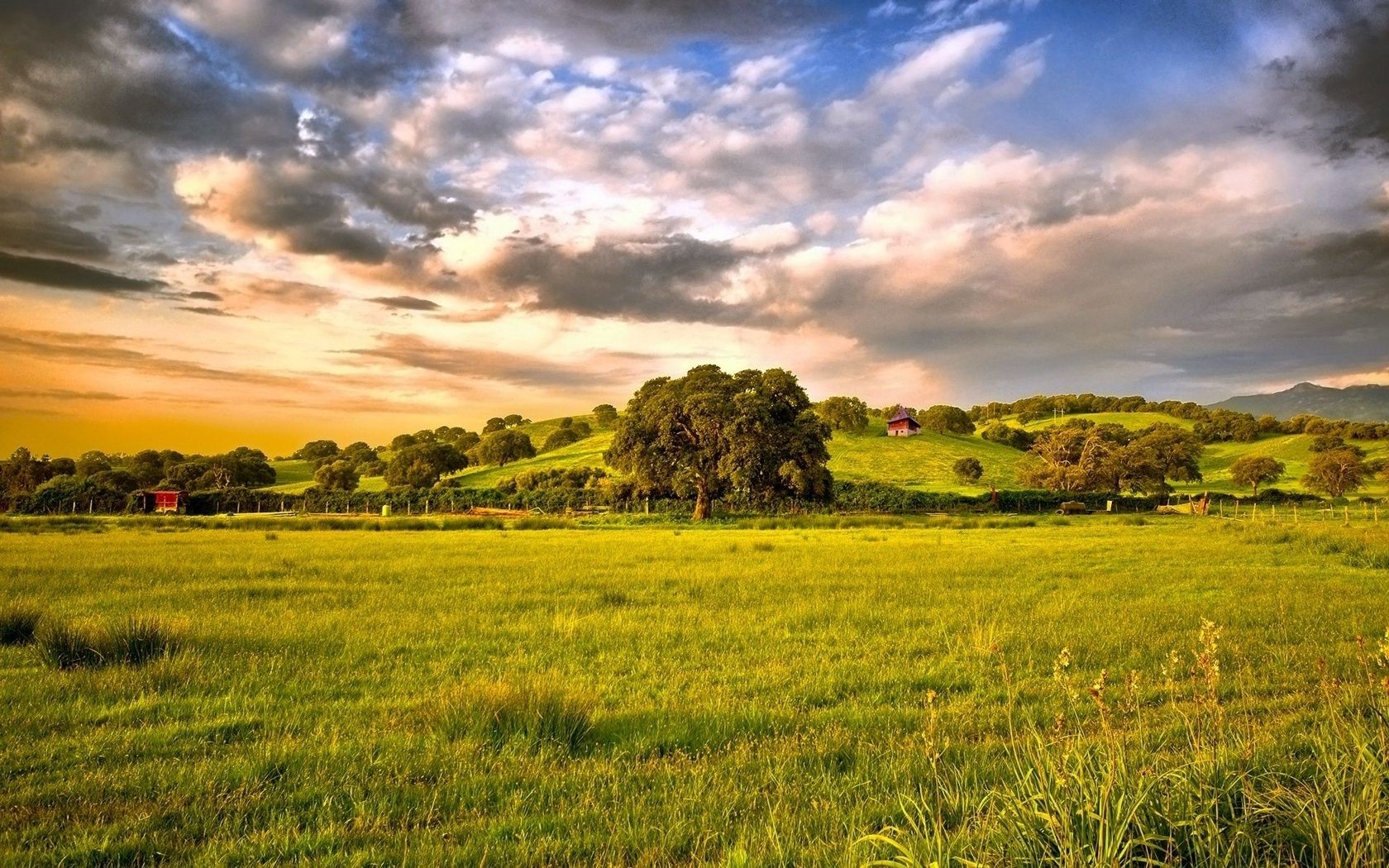 Zielona równina z domkiem w oddali