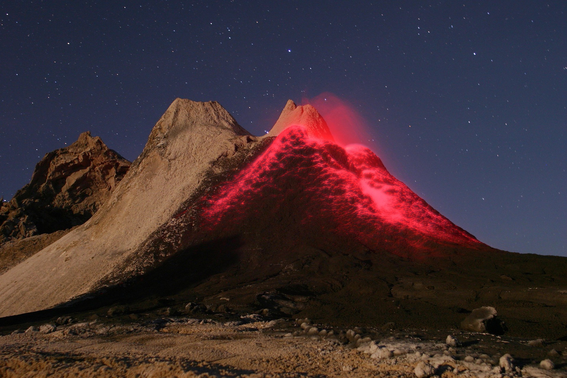 Wybuch wulkanu po wśród nocnego gwiaździstego nieba