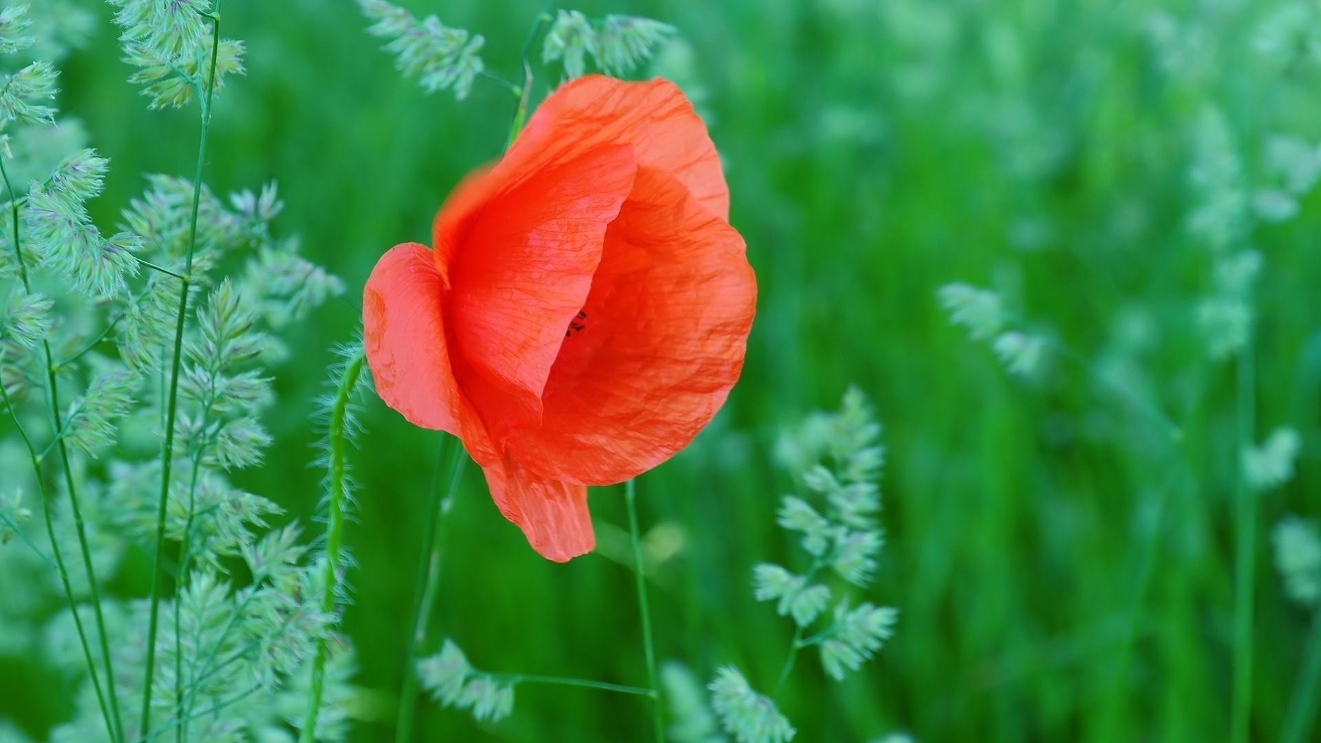 Czerwony kwiat na tle zielonej trawy