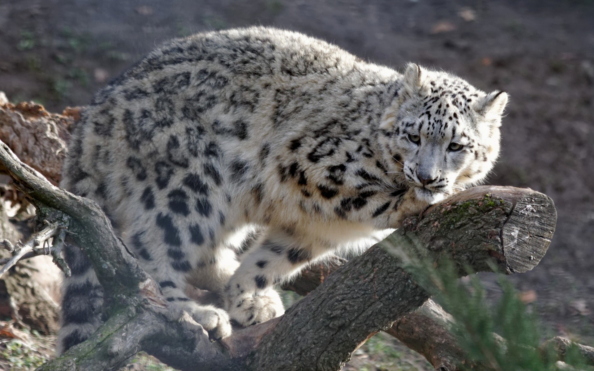 Lampart śnieżny siedzi na drzewie