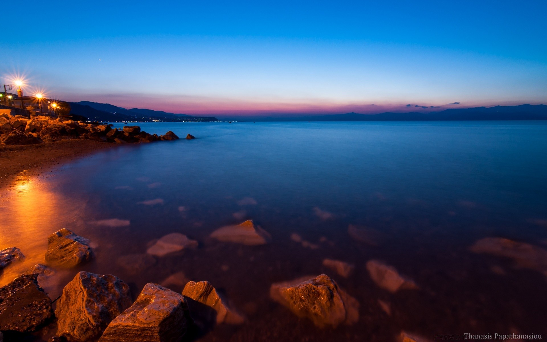 Zatoka morska o zachodzie słońca, Zmierzch, skalisty brzeg, światła nocnego kurortu