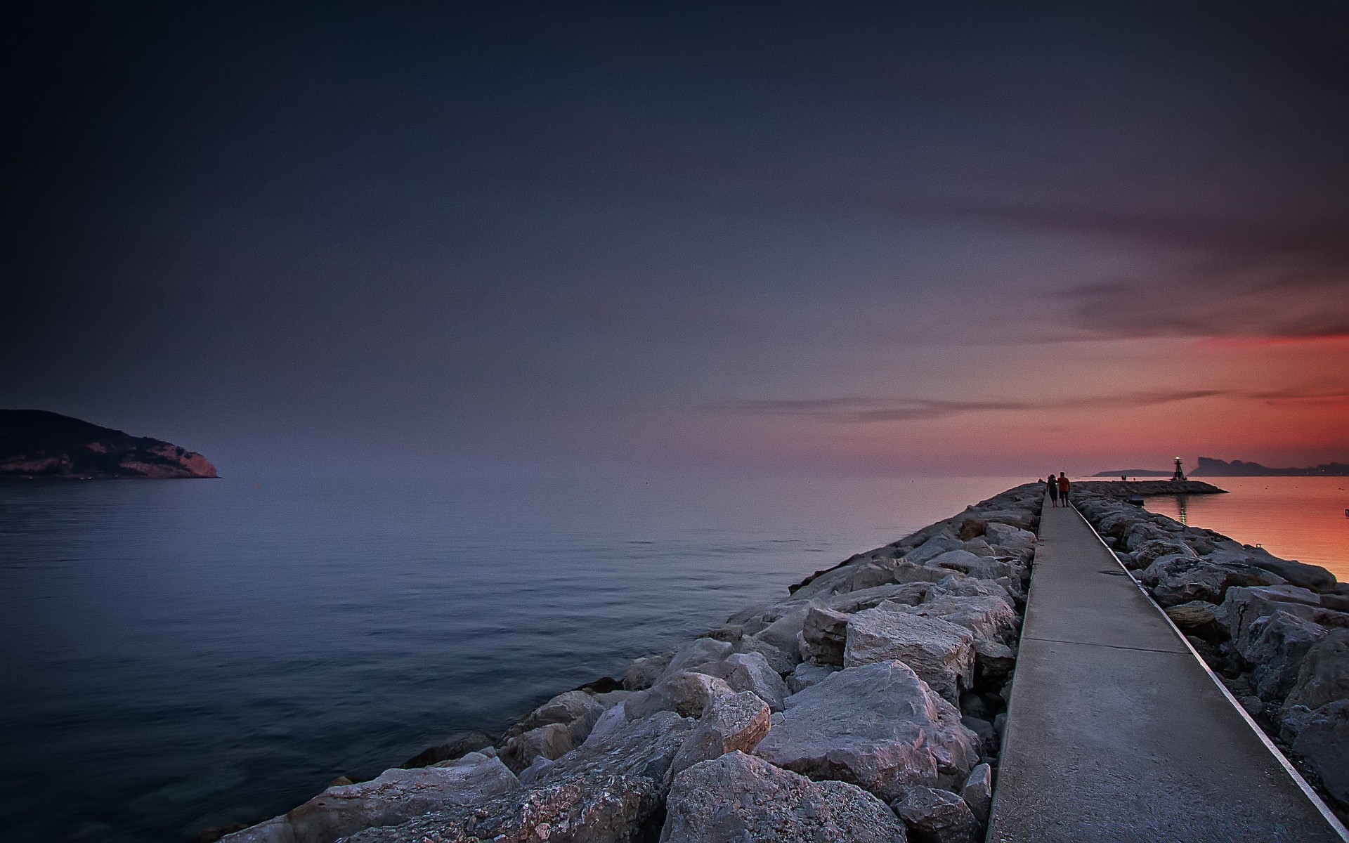 Wybrzeże morskie z latarnią morską i żaglówką na tle odchodzącego słońca