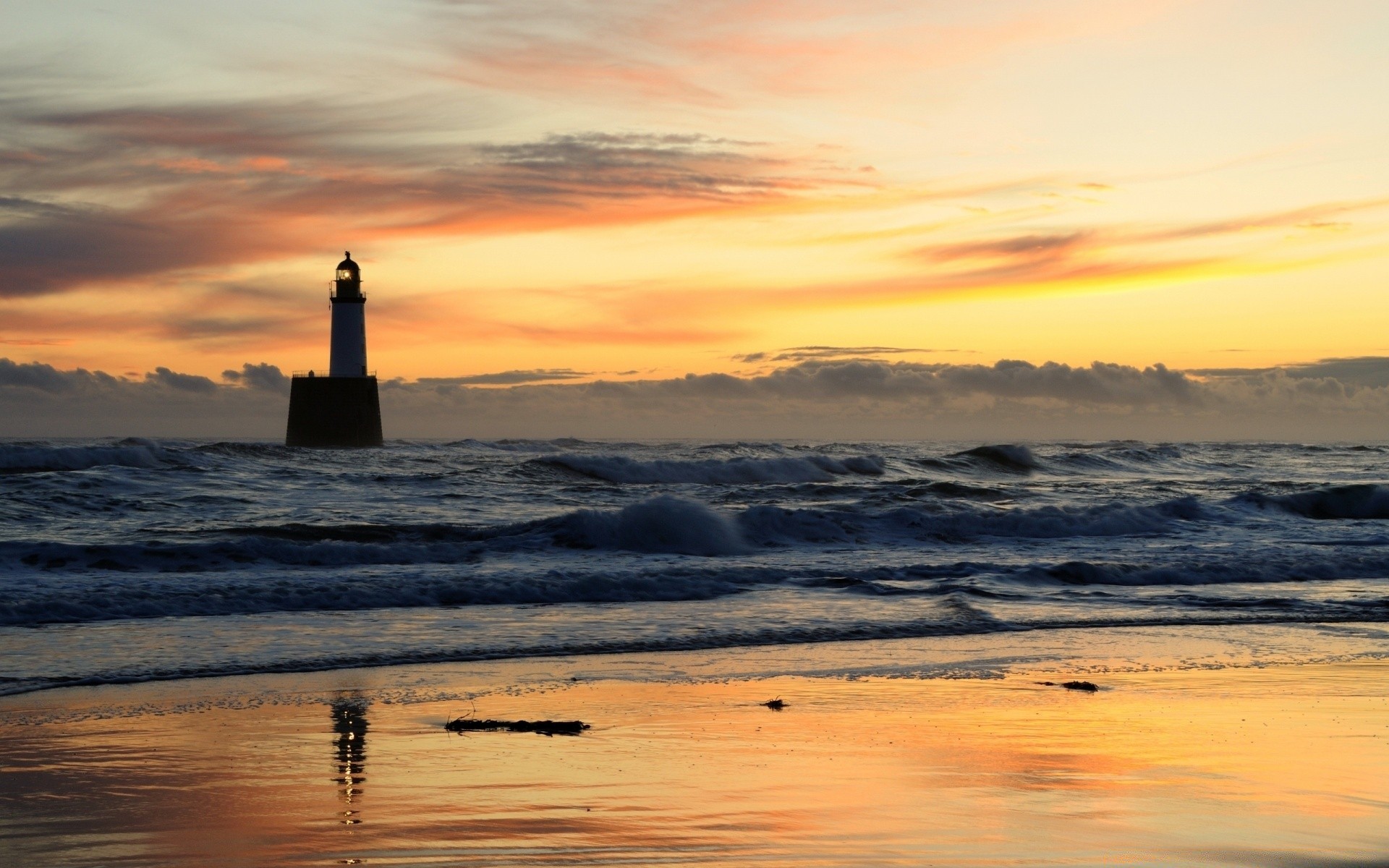 Latarnia morska, Zatoka, wieczorny morski Zachód słońca