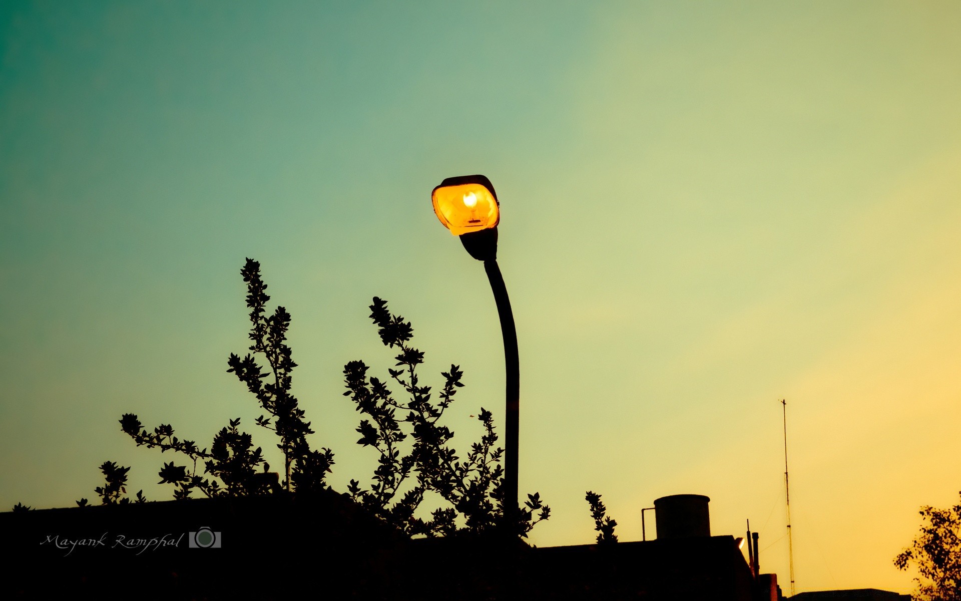 Samotna Latarnia morska otoczona wodą i zieloną roślinnością o zachodzie słońca