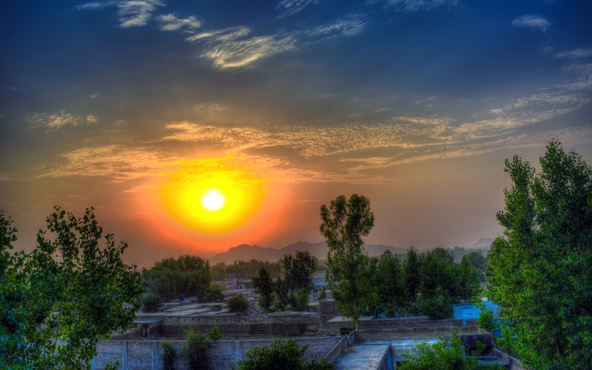 Wieczorny krajobraz pod drzewem o zachodzie słońca