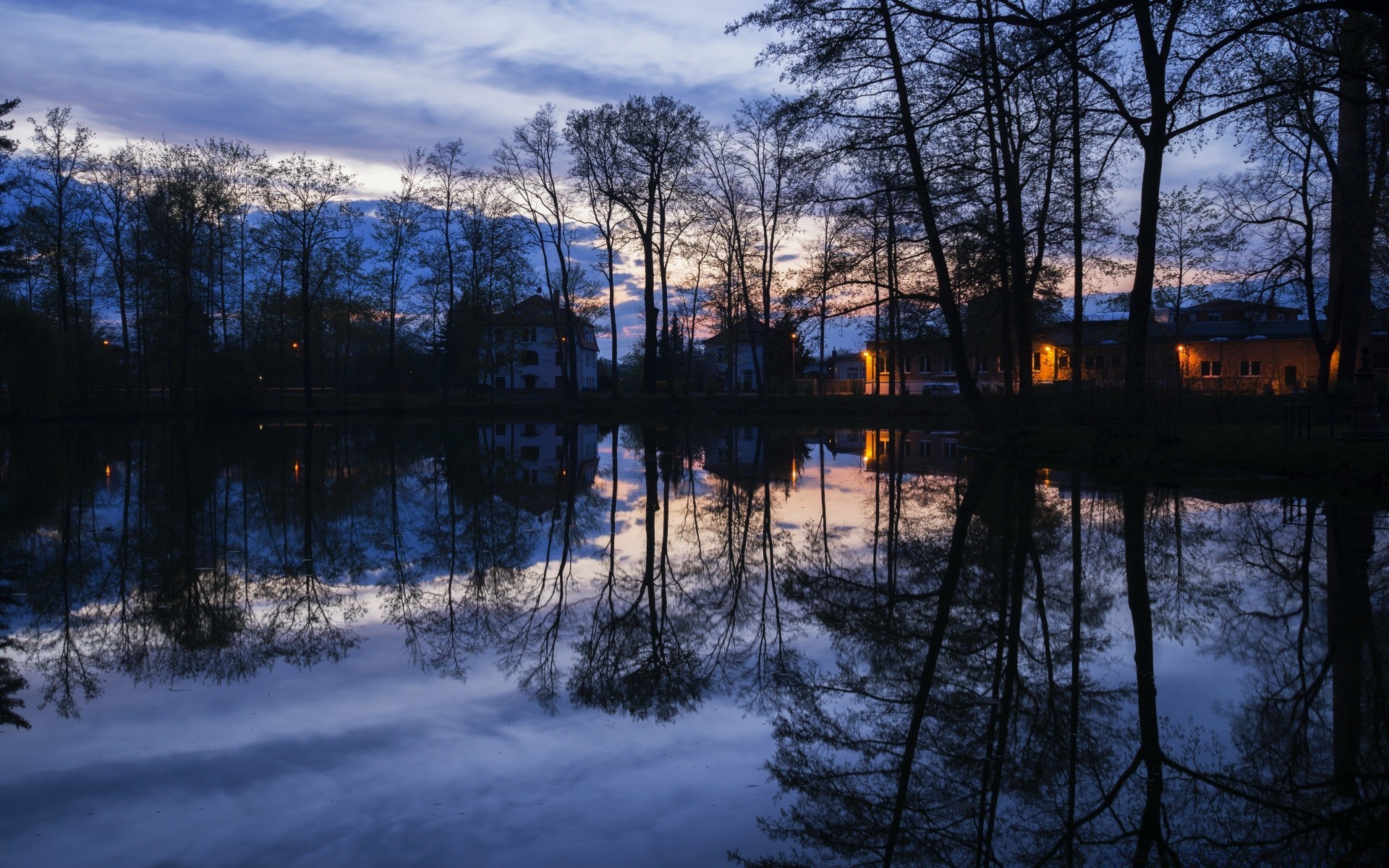 Odbicie zachodu Słońca na leśnym jeziorze krajobraz