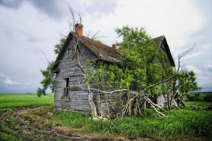 Dziwna chata na polu wśród suchych drzew i trawy