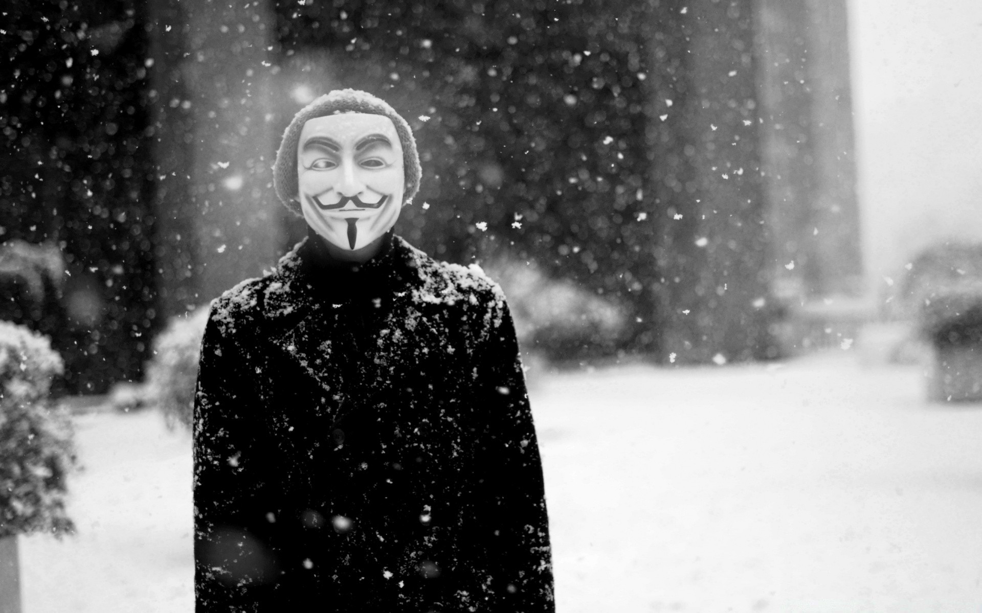 Zamaskowany mężczyzna na tle śnieżnej ulicy