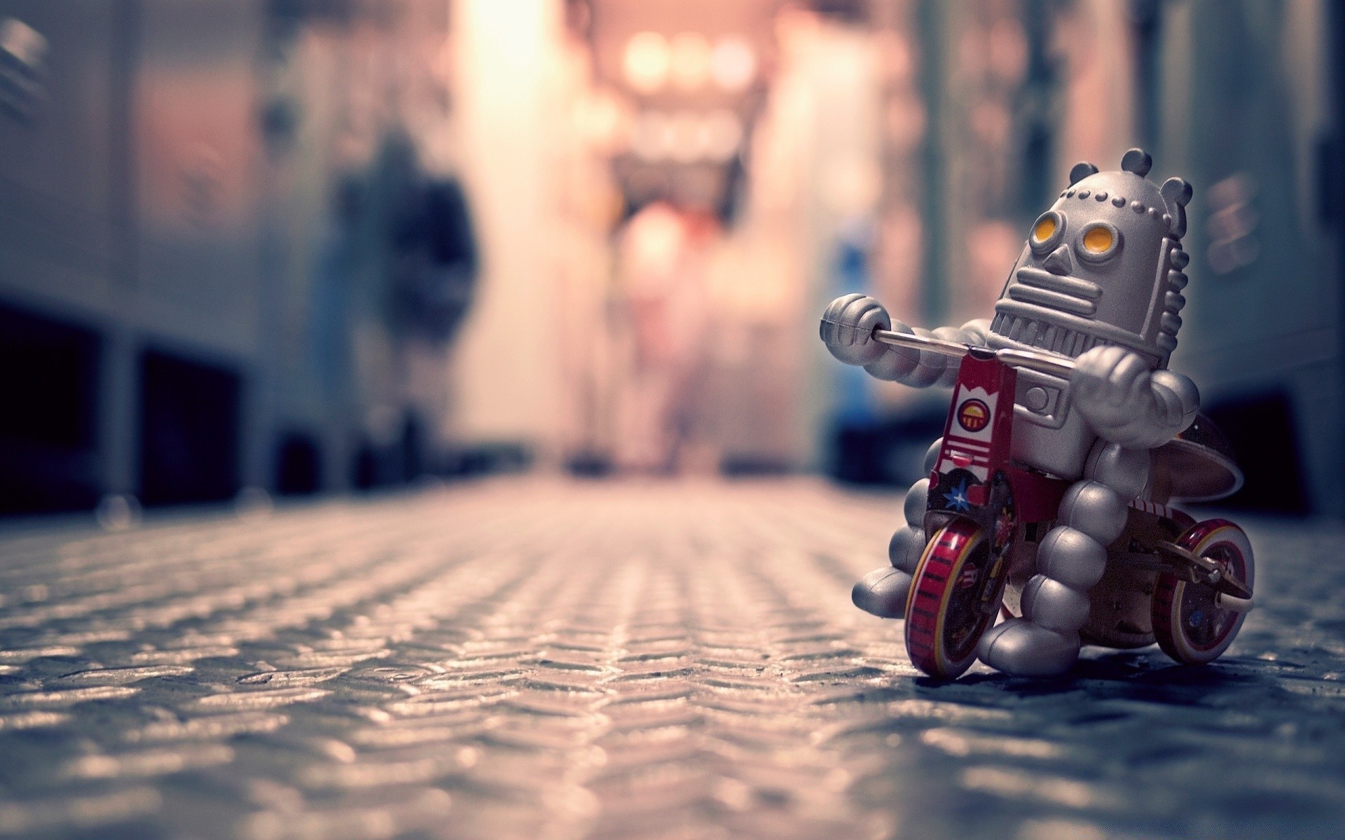 Mały szary Robot jedzie na motocyklu