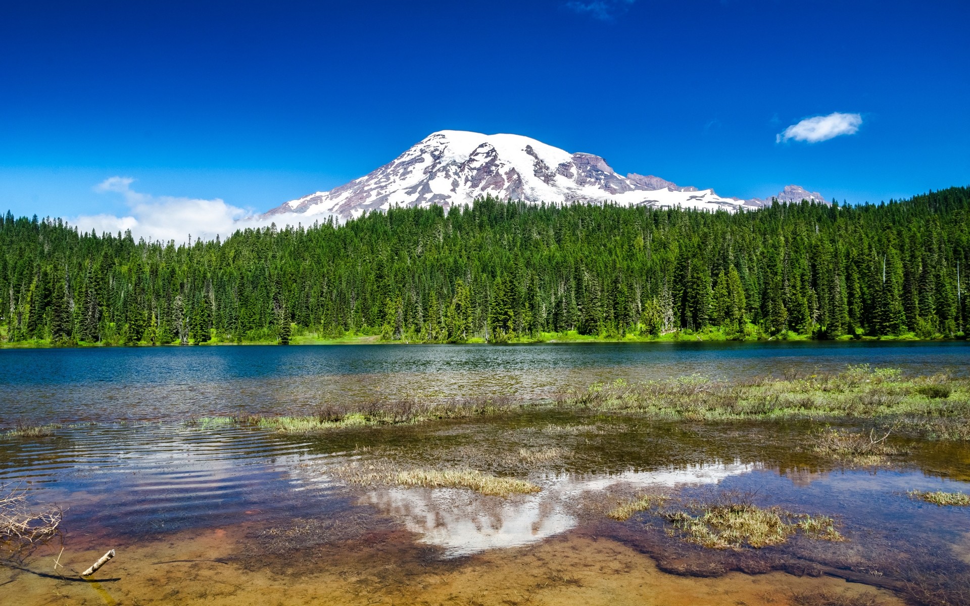 Ośnieżona góra na błękitnym niebie otoczona zielonym lasem z jeziorem