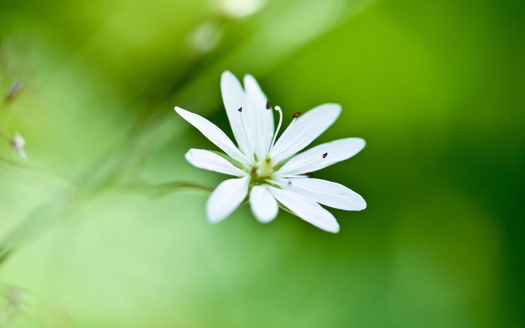 Biały delikatny kwiat na zielonym tle fotografowanie makro