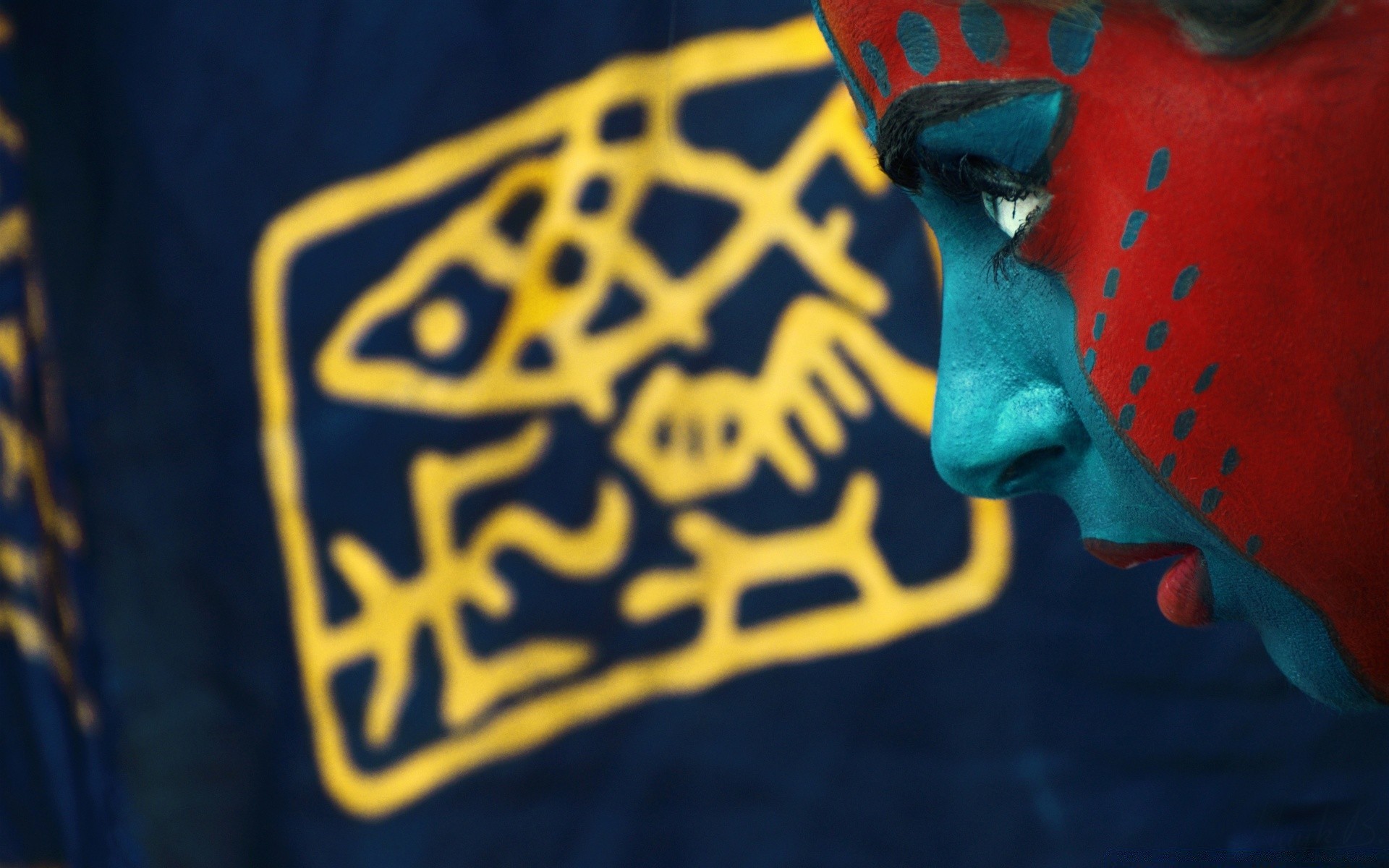 Dziewczyna z pomalowaną twarzą na tle żółtego symbolu