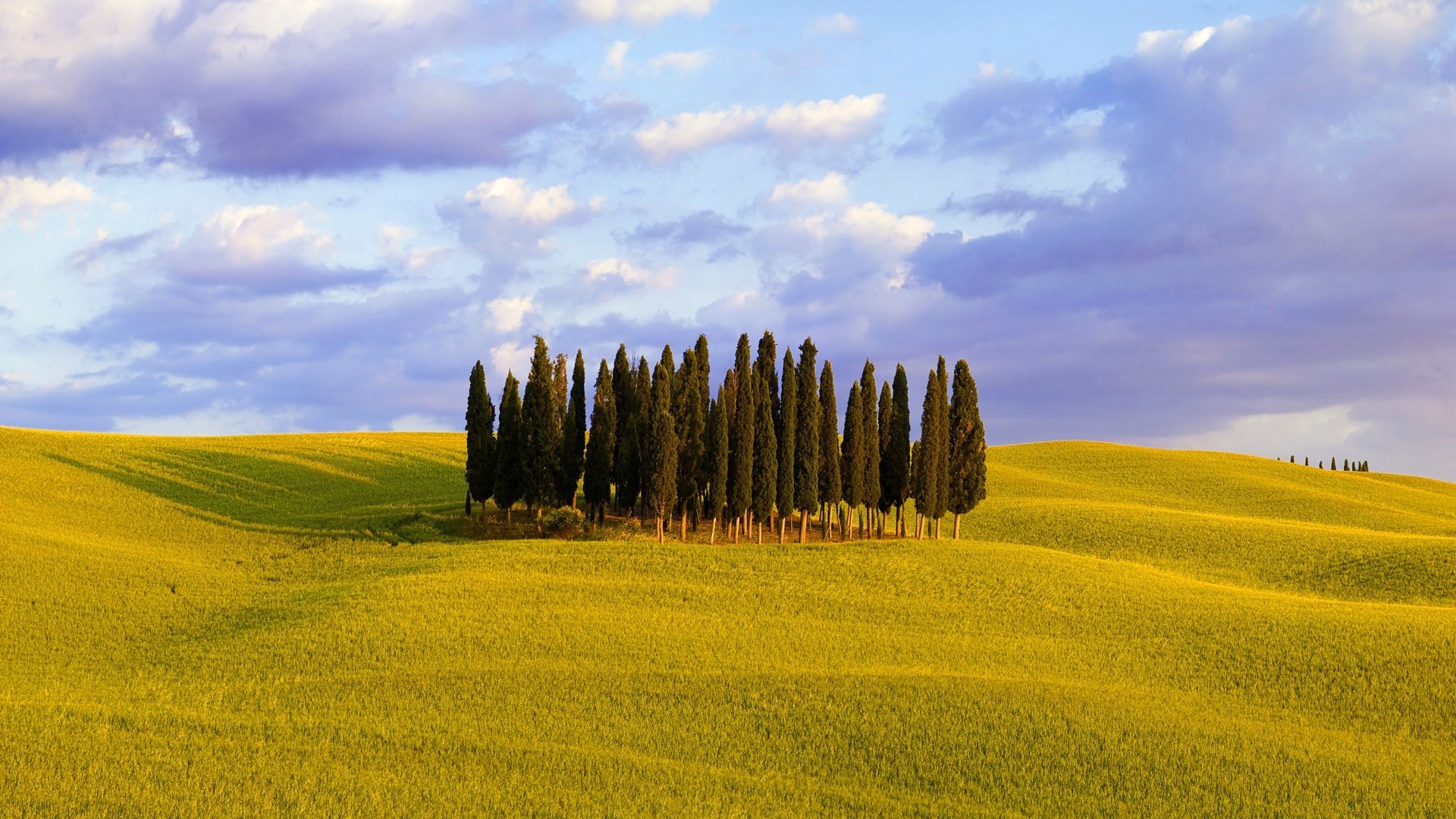 Zachód słońca z ośnieżonymi drzewami na zboczu