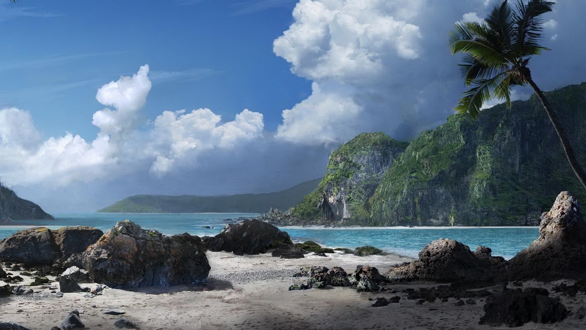 Podwójna tęcza na tle tropikalnych gór i Palm