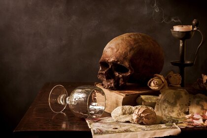 Martwa natura na stole z czaszką