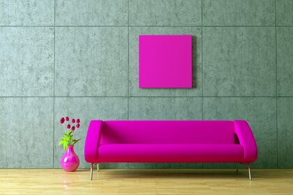 Nowoczesny wystrój. Meble w kolorze różowym na szarym tle