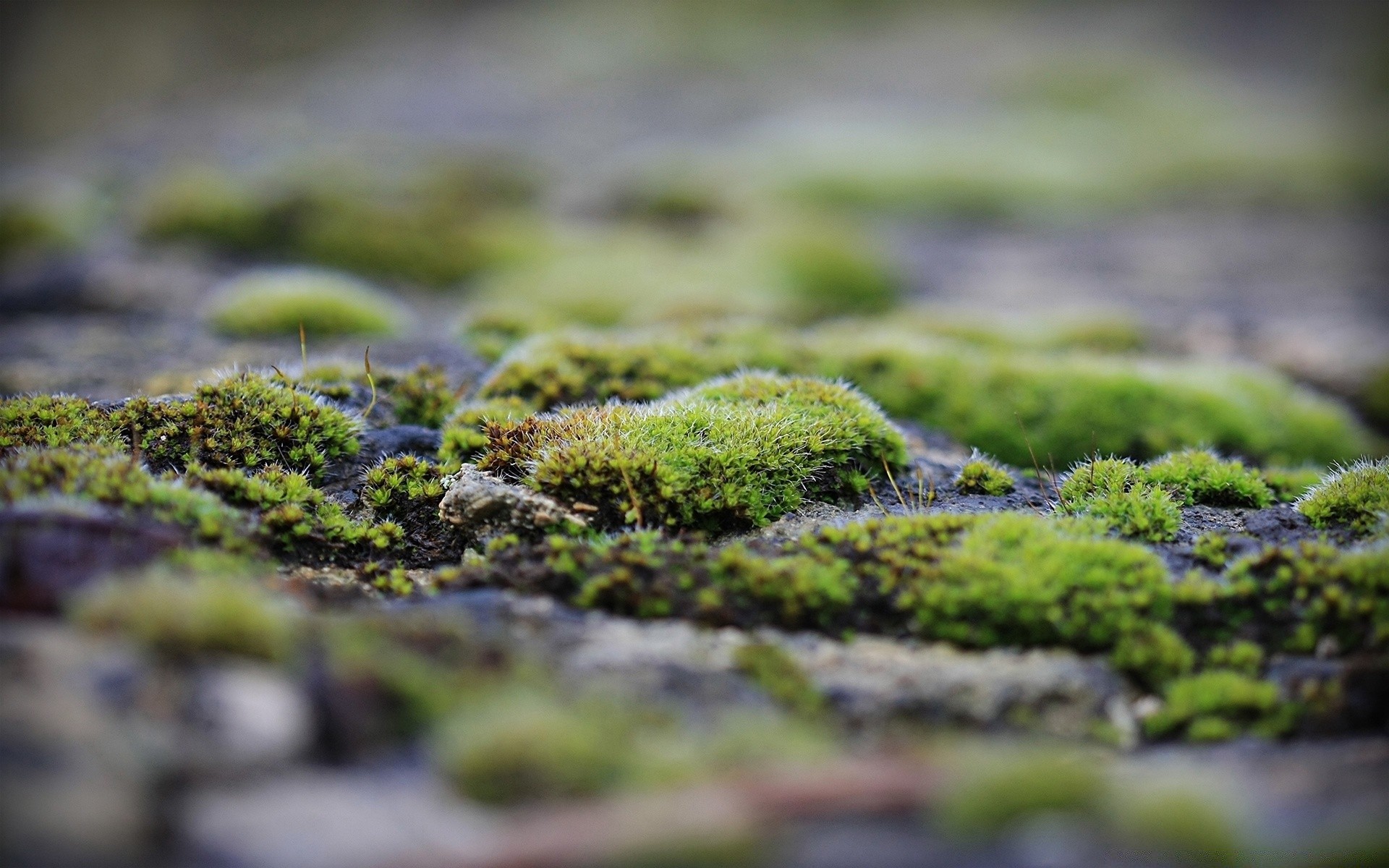 Drzewa i mech. Królestwo jest zielone. Leśny krajobraz