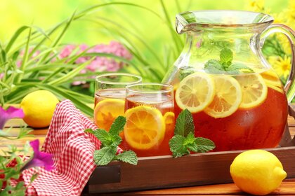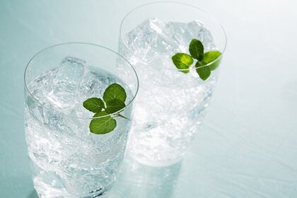 Dwie szklanki wody, kawałków lodu i liści mięty