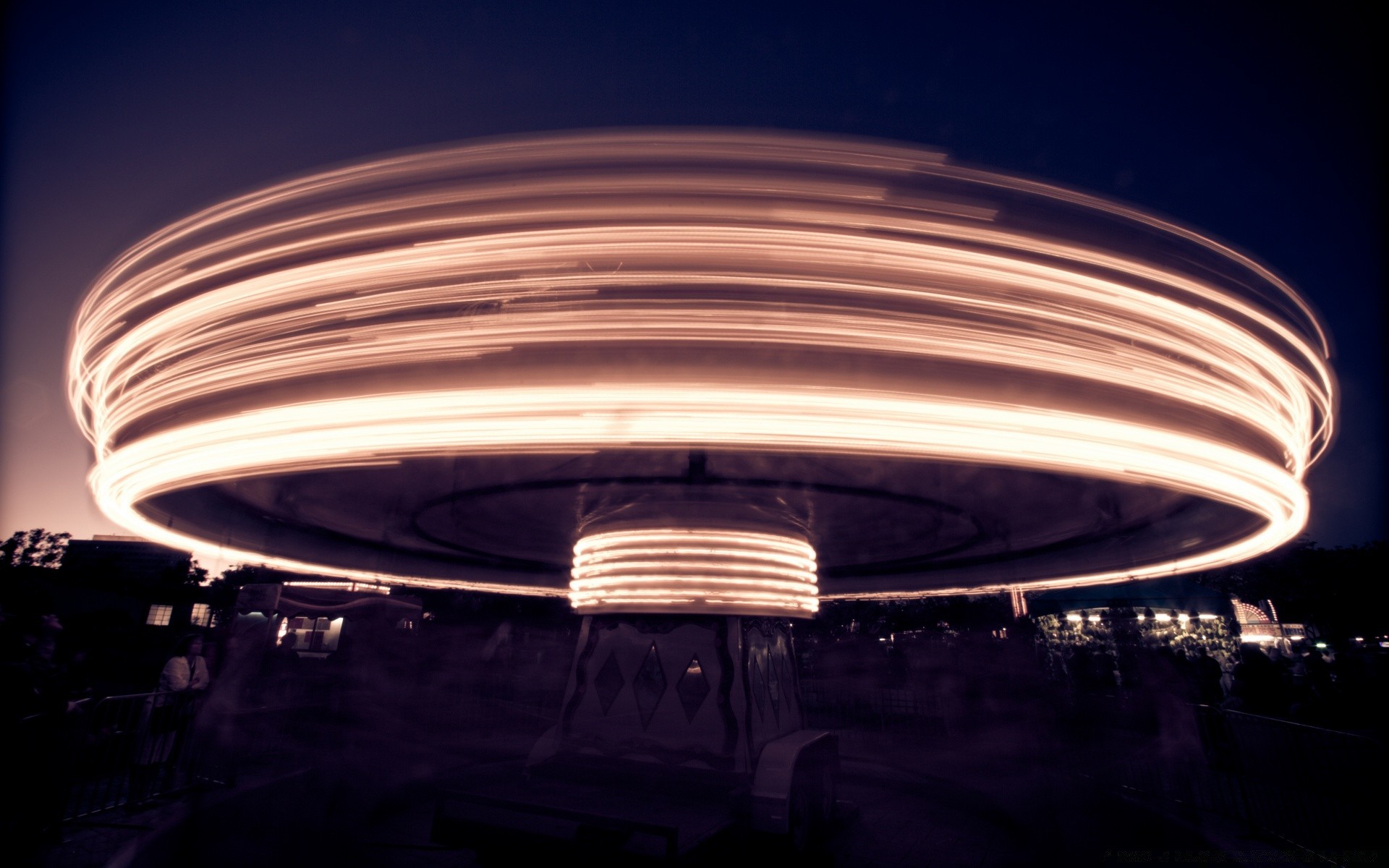 Okrągły duży budynek na jednym filarze na tle nocnego miasta