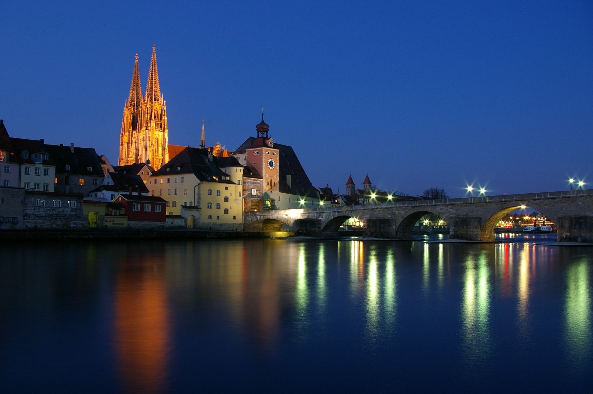 Piękne miasto nad rzeką wieczorem